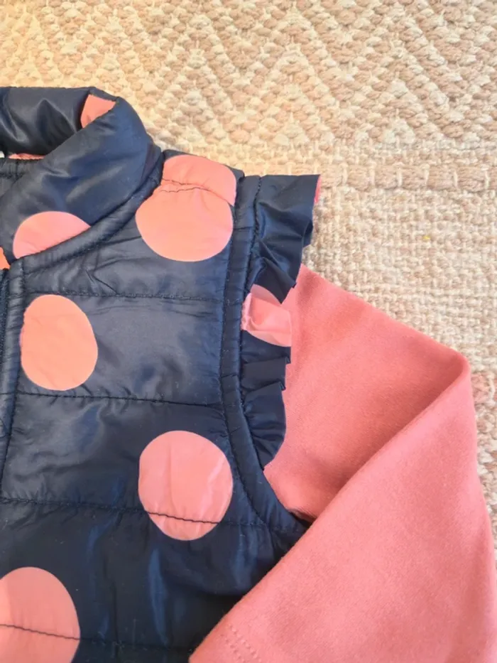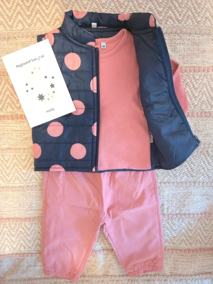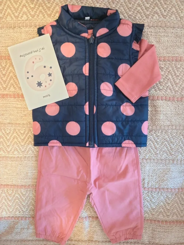Ensemble neuf 3 pièces, composé d'un haut manches longues, un pantalon type jogging en toile, une veste sans manches à pois.