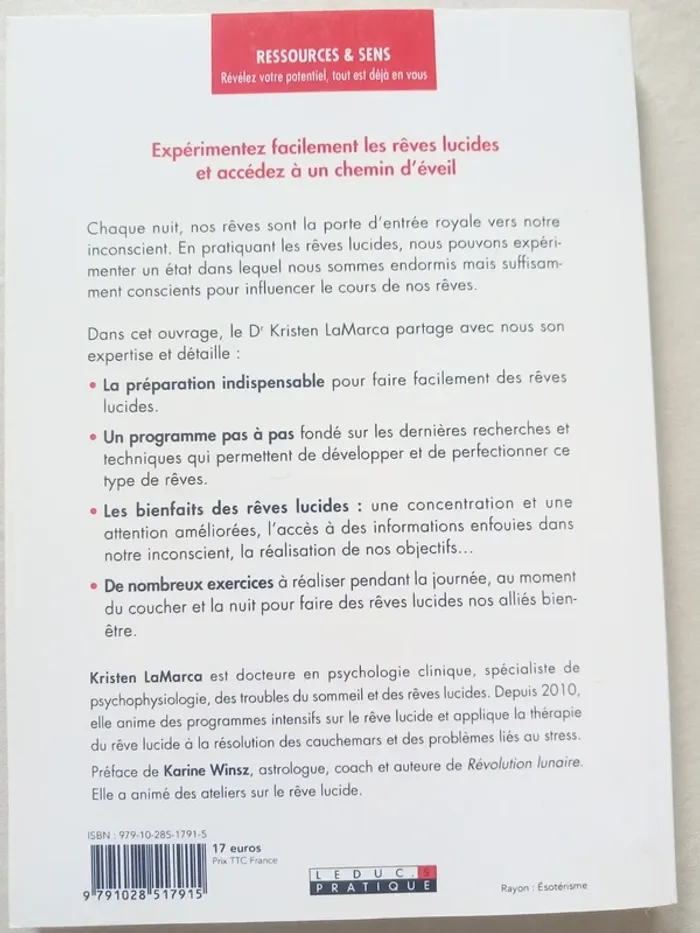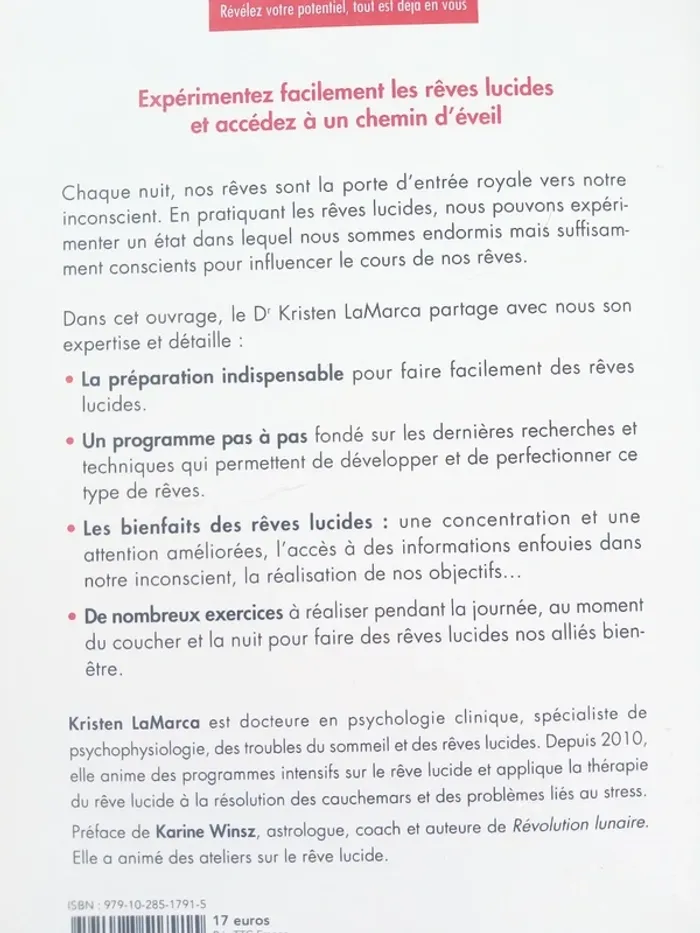 Le pouvoir des rêves lucides Boostez votre créativité et déployez votre potentiel grâce à vos rêves Docteur Kristen Lamarca Editions Leduc (2020) Broché, 208 pages Neuf Expérimentez facilement les rêves lucides et accédez à un chemin d'éveil. Chaque nuit, nos rêves sont la porte d'entrée royale vers notre inconscient. En pratiquant les rêves lucides, nous pouvons expérimenter un état dans lequel nous sommes endormis mais suffisamment conscients pour influencer le cours de nos rêves. Dans cet ouvrage, le Dr Kristen LaMarca partage avec nous son expertise et détaille : - La préparation indispensable pour faire facilement des rêves lucides. - Un programme pas à pas fondé sur les dernières recherches et techniques qui permettent de développer et de perfectionner ce type de rêves. - Les bienfaits des rêves lucides : une concentration et une attention améliorées, l'accès à des informations enfouies dans notre inconscient, la réalisation de nos objectifs... - De nombreux exercices à réaliser pendant la journée, au moment du coucher et la nuit pour faire des rêves lucides nos alliés bien-être. #lily2905jeuxjouetslivresbd #lily2905loisirsjeuxjouetslivresbd