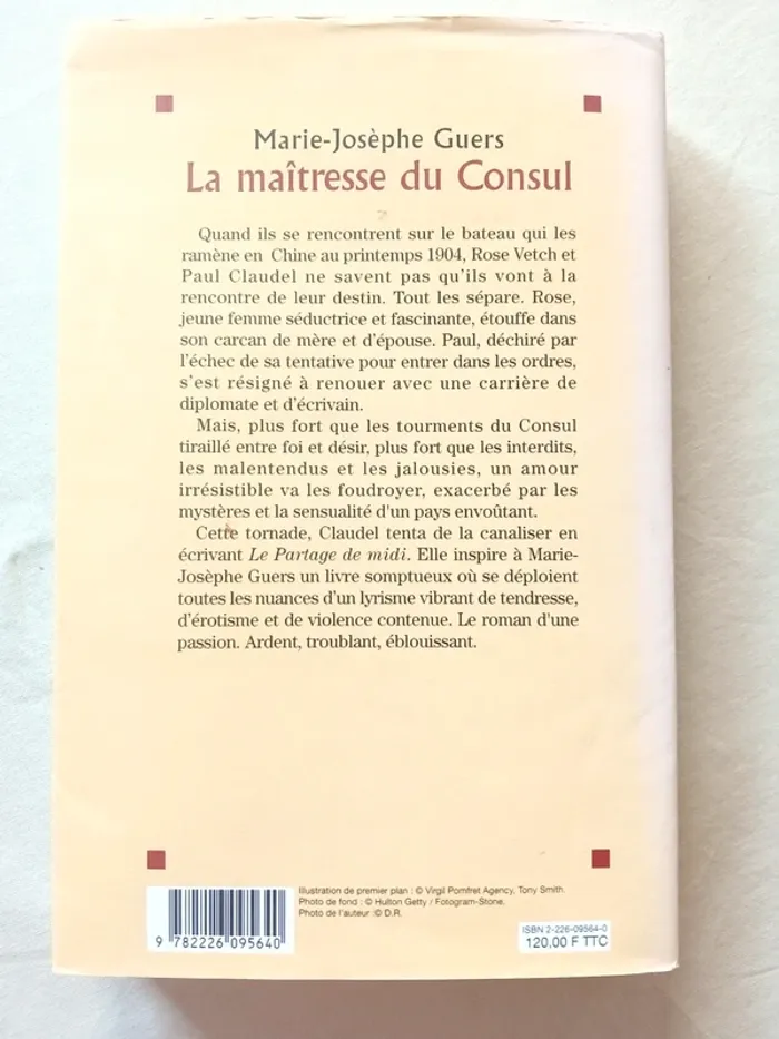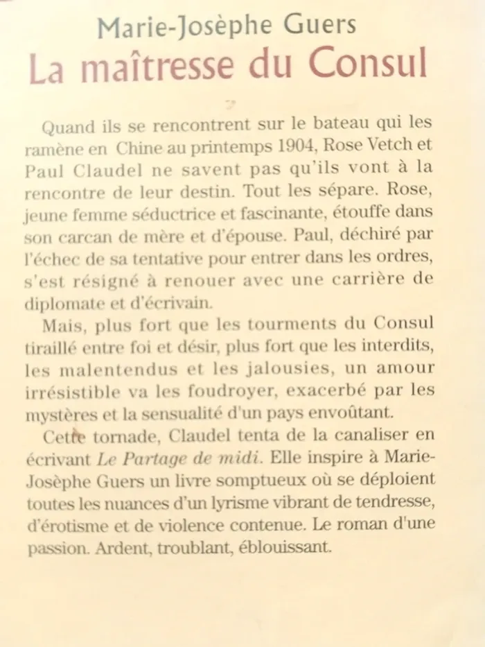 Roman La maîtresse du Consul Marie-Josèphe Guers Éditions Albin Michel (1998) 336 Pages Très bon état Quand ils se rencontrent sur le bateau qui les ramène en Chine au printemps 1904, Rose Vetch et Paul Claudel ne savent pas qu'ils vont à la rencontre de leur destin. Tout les sépare. Rose, jeune femme séductrice et fascinante, étouffe dans son carcan de mère et d'épouse. Paul, déchiré par l'échec de sa tentative pour entrer dans les ordres, s'est résigné à renouer avec une carrière de diplomate et d'écrivain. Mais, plus fort que les tourments du Consul tiraillé entre foi et désir, plus fort que les interdits, les malentendus et les jalousies, un amour irrésistible va les foudroyer, exacerbé par les mystères et la sensualité d'un pays envoûtant. Cette tornade, Claudel tenta de la canaliser en écrivant Le Partage de midi. Elle inspire à Marie-Josèphe Guers un livre somptueux où se déploient toutes les nuances d'un lyrisme vibrant de tendresse, d'érotisme et de violence contenue. Le roman d'une passion. Ardent, troublant, éblouissant. #lily2905jeuxjouetslivresbd #lily2905loisirsjeuxjouetslivresbd