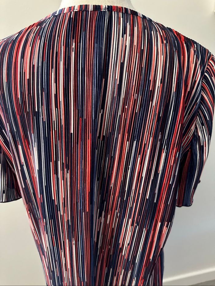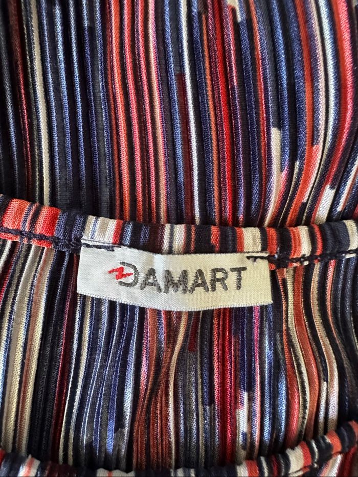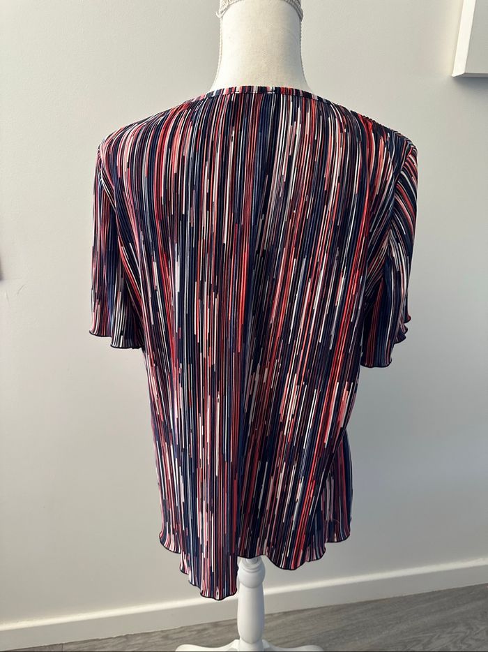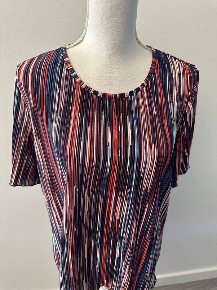 Blouse - Excellent état - Taille 40 équivalent L Dimensions en bas de l’annonce - Bleue rouge et blanche - Manches courtes - Marque Damart - Tissus en relief - Pas d’étiquette de taille ni de matière - Tissus stretch Dimensions: - 60 à 72cm niveau aisselles - 70cm de long