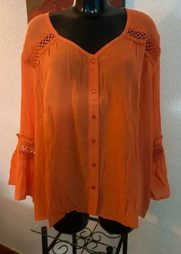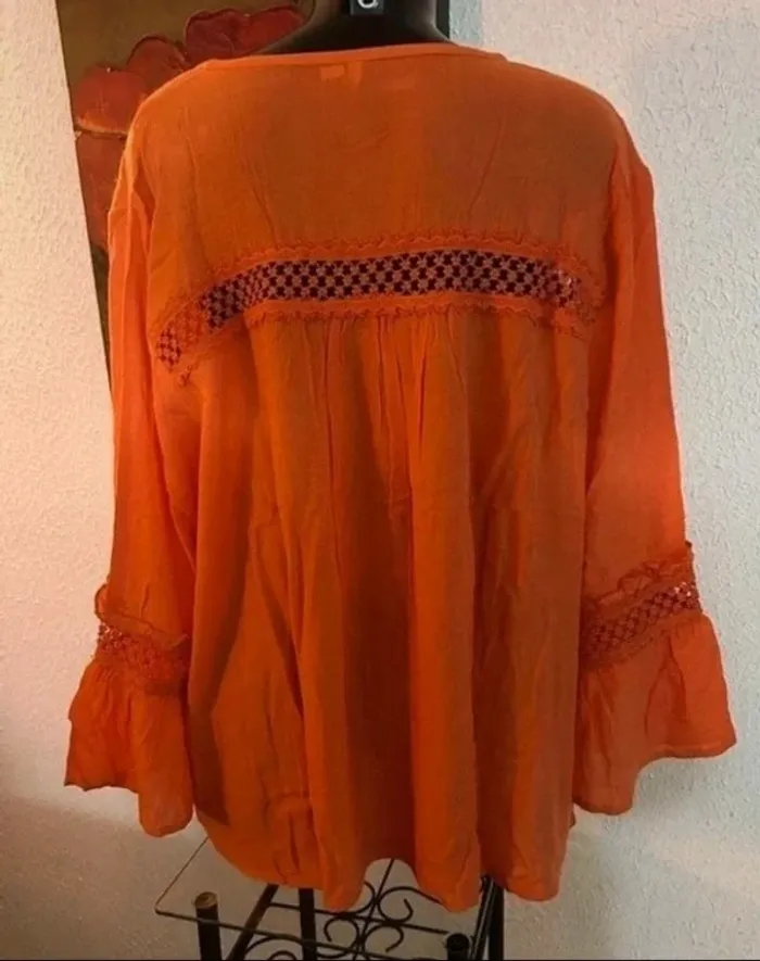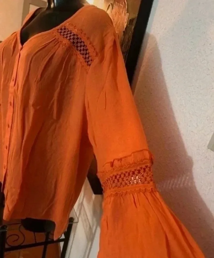 Blouse unie détails macramé - Col V - Entièrement boutonnée devant - Empiècement en macramé ajouré sur les épaules - Manches longues avec galon de macramé ajouré et volant en base - Dos rehaussé de macramé - Base évasée, légèrement arrondie - Longueur 65 cm env. Composition : - Crépon 100% viscose Taille : 44 Coloris : orange Prix : 12€ Neuve jamais portée #sisterkayafemmeT44 Réf : b.0a +1