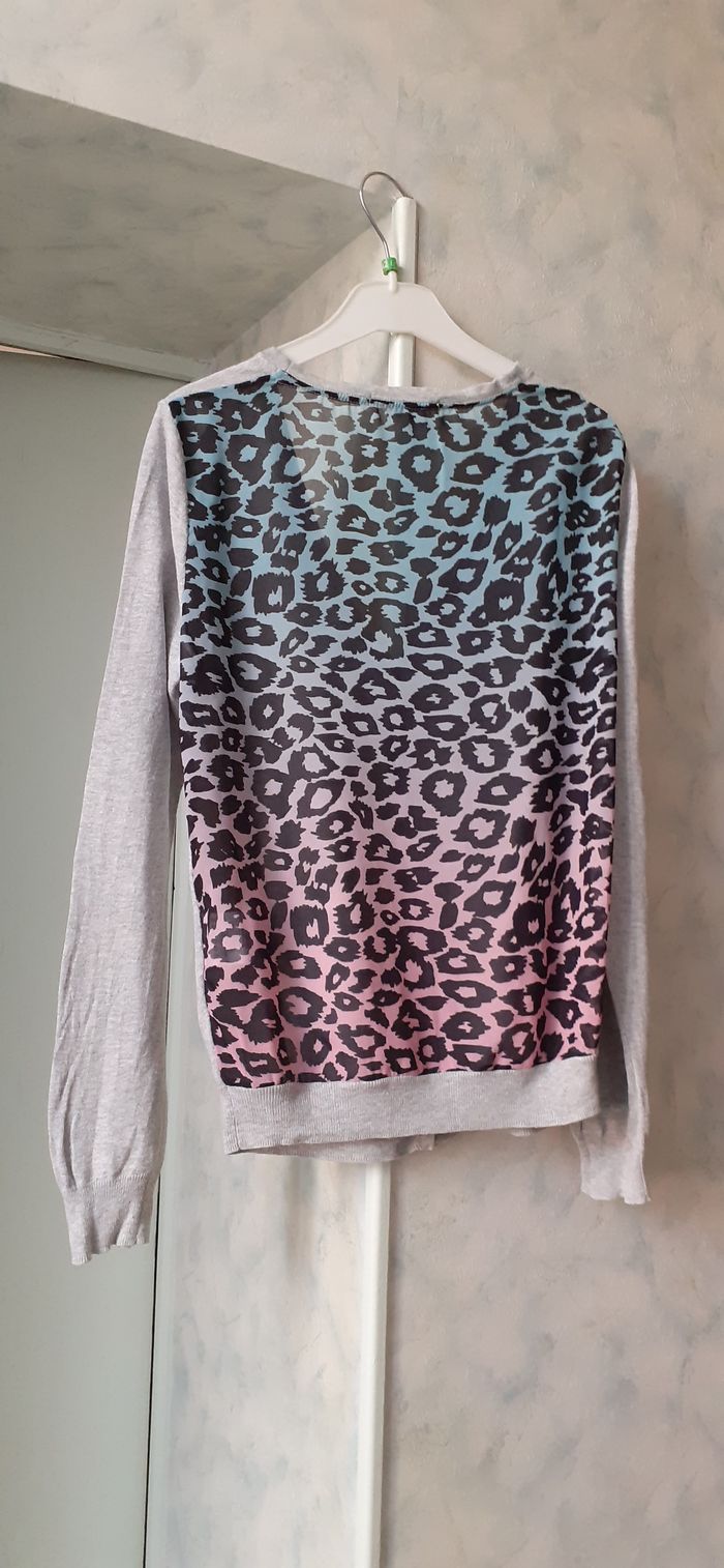 Vends un gilet original en maille très fine devant 100 % coton et en polyester dans le dos, couleur gris clair devant, bleu et rose imprimé léopard derrière, marque Teddy Smith, taille 2. Longueur dans le dos : 58 cm Largeur aisselle à aisselle : 47 cm