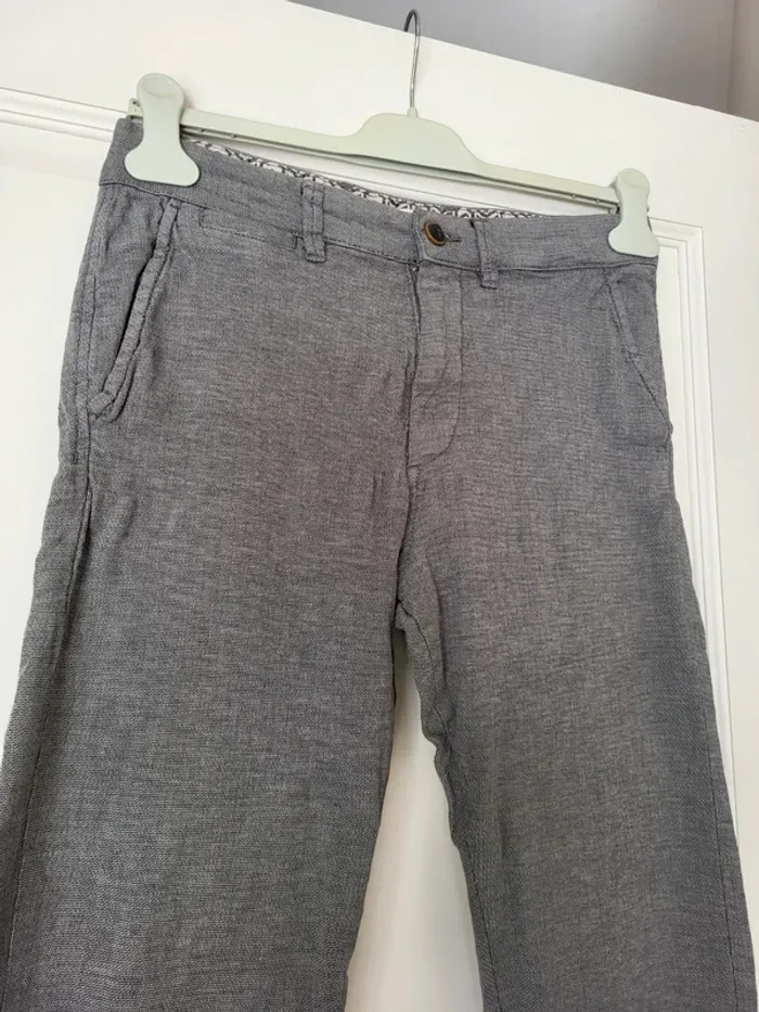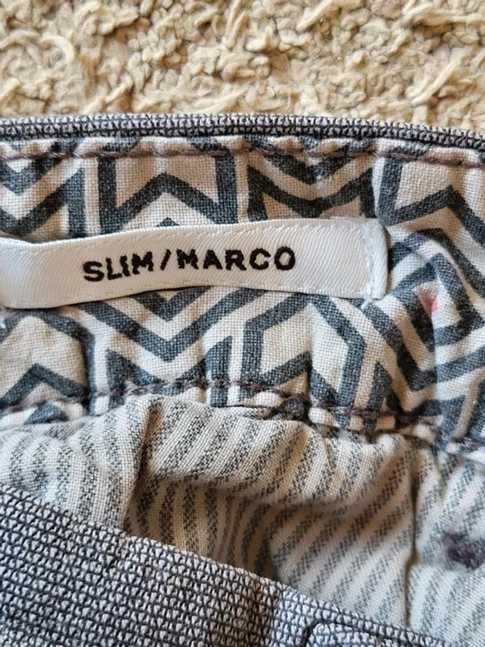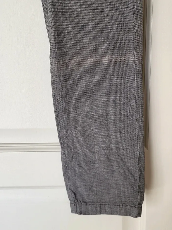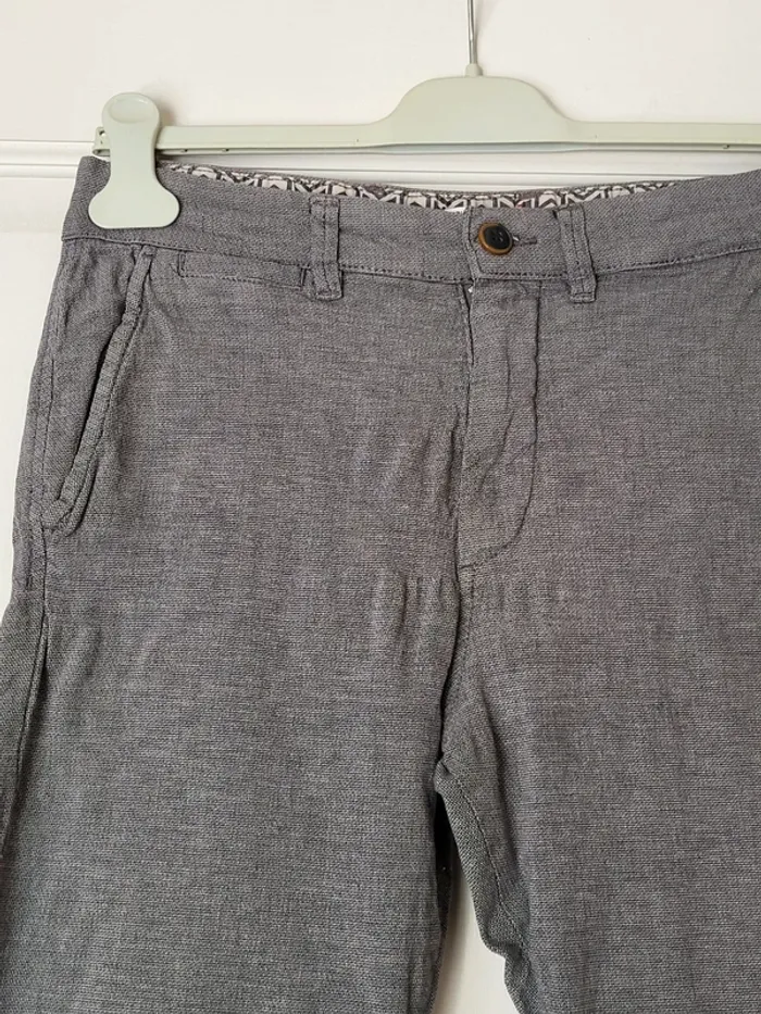💝 Bénéficiez d'une réduction en créant lot dans mon dressing 🛍️ 🌸 Pantalon chino Jack & Jones, modèle Marco À signaler : une ligne de décoloration en bas de la jambe gauche (moins visible en vrai que sur la photo) 🎀 En coton biologique texturé de couleur grise 🪷 Coupe slim 🍥 Taille 30, qui correspond à un 36 Largeur à la taille : 36 cm Longueur : 98 cm 🩷 Peut être porté avec une chemise cintrée bleu marine pour un look à la fois décontracté et élégant
