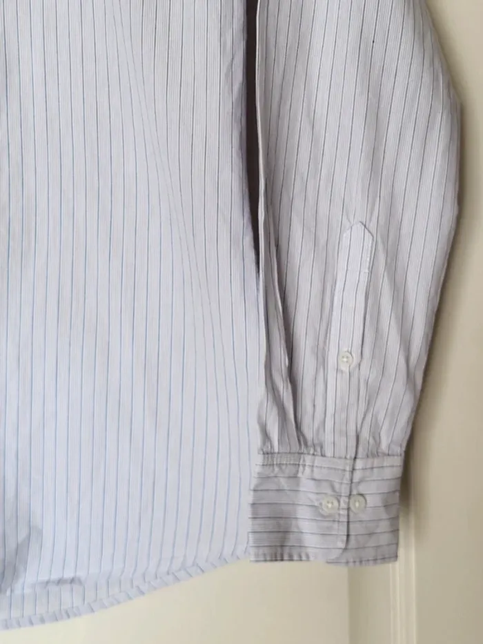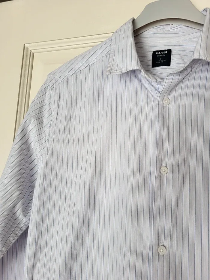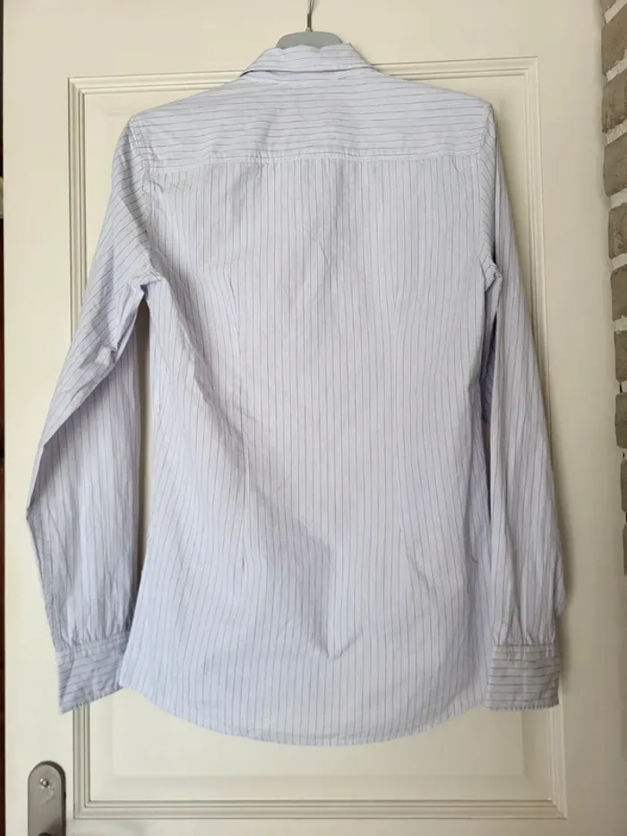 💝 Bénéficiez d'une réduction en créant lot dans mon dressing 🛍️ 🌸 Chemise Kiabi en très bon état, sans aucun défaut 🎀 Blanche avec de fines rayures bleues 🪷 Légère et confortable, slim fit Manches longues boutonnées aux poignets 🍥 Taille S, 37/38 🩷 Parfaite avec un chino beige et des derbies pour un style élégant mais décontracté.