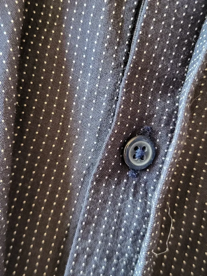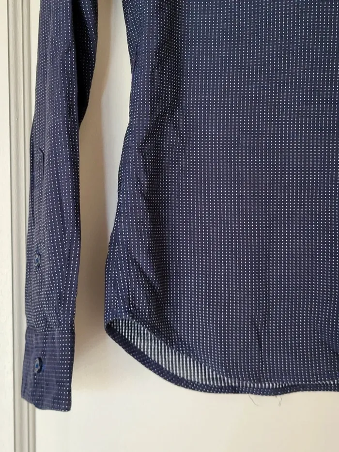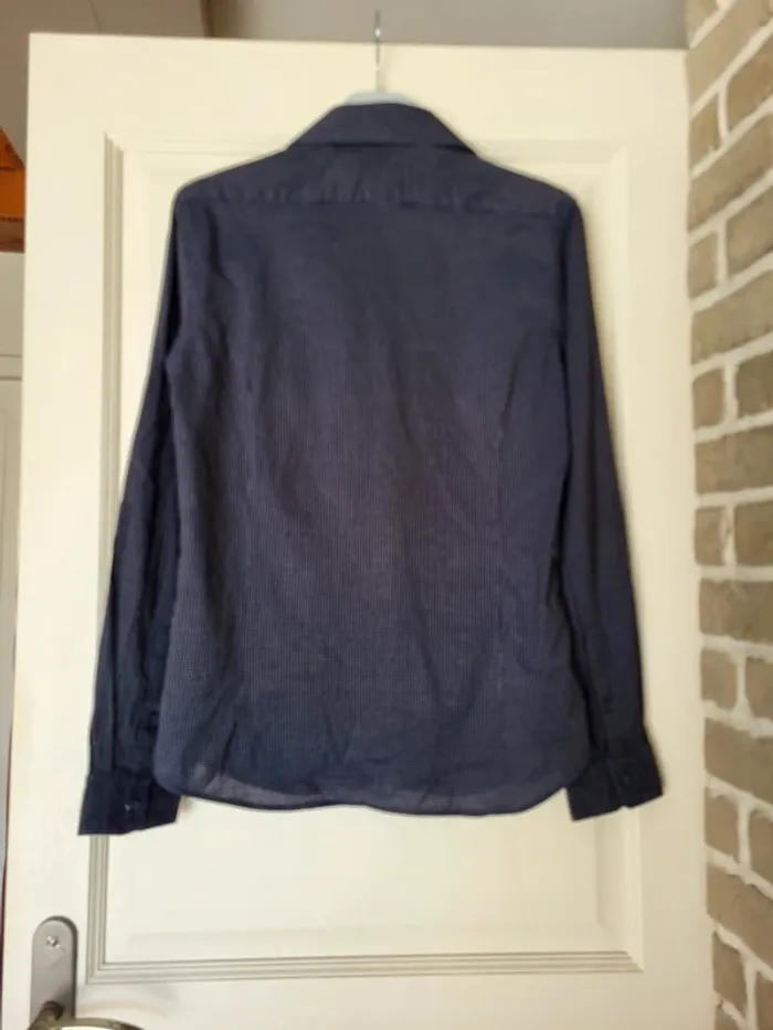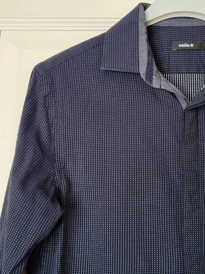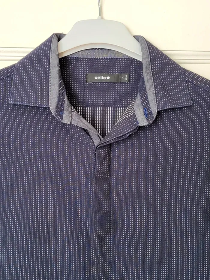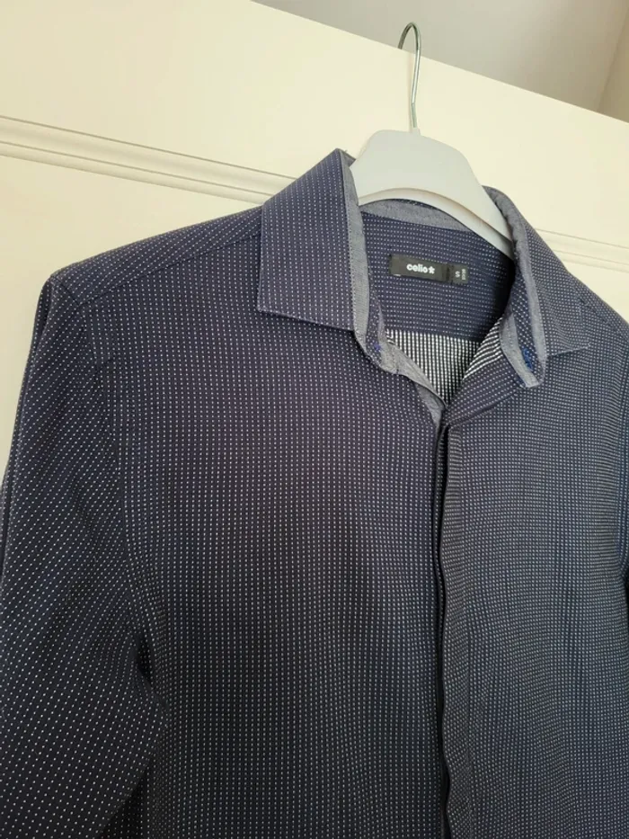 💝 Bénéficiez d'une réduction en créant lot dans mon dressing 🛍️ 🌸 Belle chemise Célio en très bon état 🎀 Bleu marine piqueté de petits points 🪷 Finitions de qualité Boutonnage dissimulé, col semi rigide et intérieur propre et soigné Manches longues boutonnées aux poignets 🍥 Taille S, 37/38 🩷 Parfaite avec un chino beige et des derbies pour un style élégant mais décontracté.
