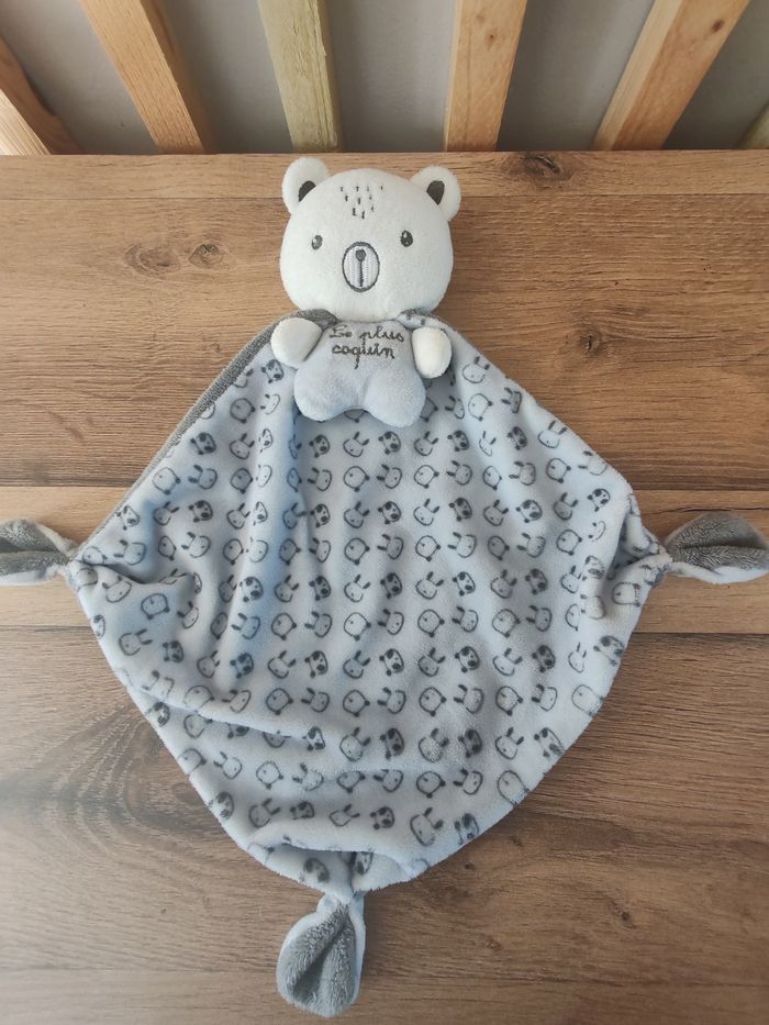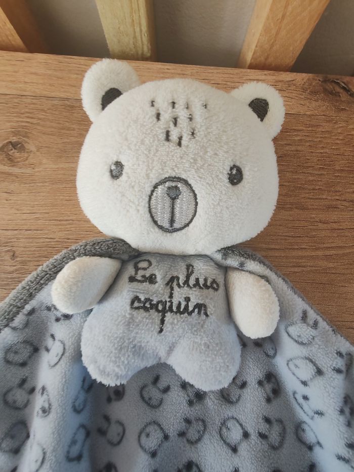 Doudou Ours bleu gris cape « Le plus coquin » MOTS D’ENFANTS Tbe Tout doux 18.90 euros Envoi en relais