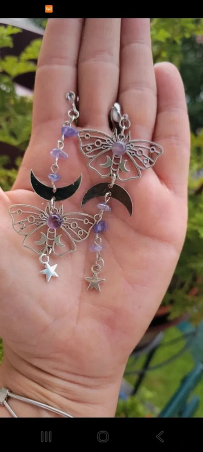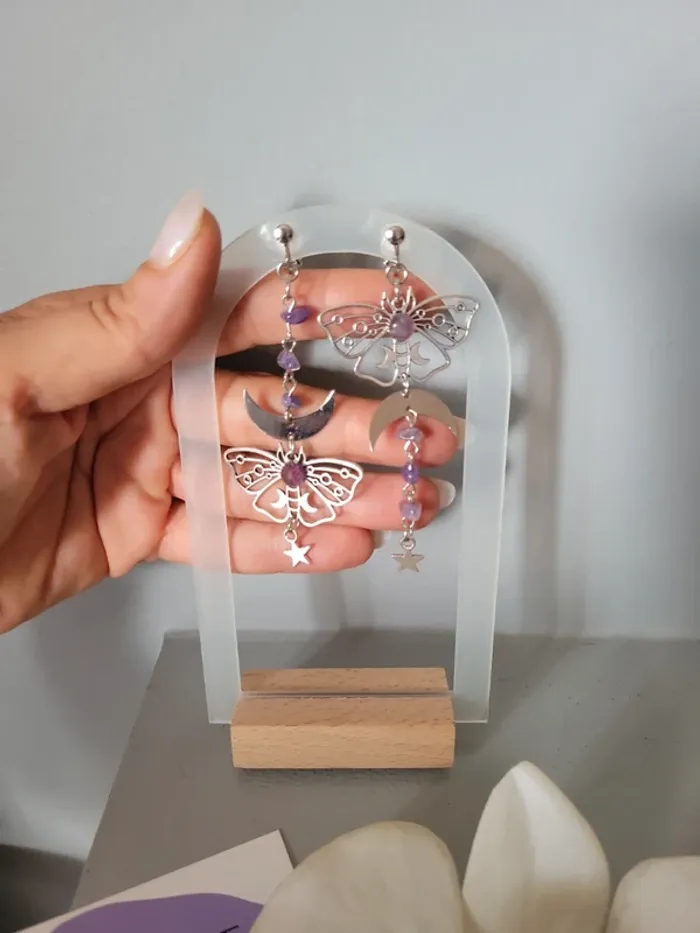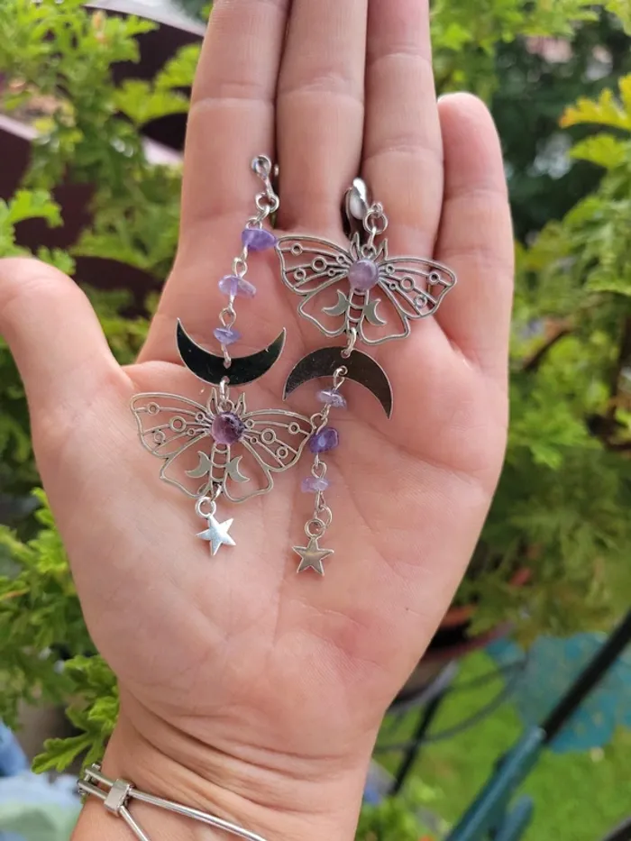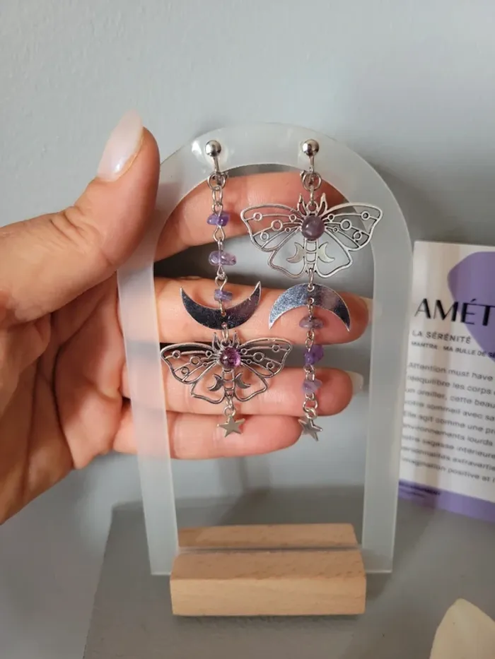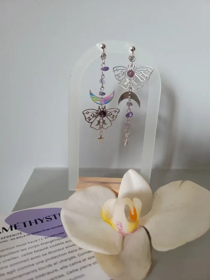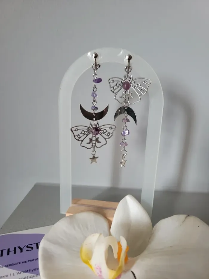 Clips d oreilles 👂 (percées ou non) Asymetriques lune et soleil. Acier inoxydable et pierres semi précieuses améthyste. L améthyste : aide à mieux dormir, combat les peurs irrationnels, l anxiété, les phobies, les dépendances (alcool, tabac...) favorise un rééquilibragemental, apaise. Modèle unique. Fait main. Lithothérapie. Possible pour oreilles percées sur demande.. Lot possible. Envoi sous 24h48h. Rapide et soigné.