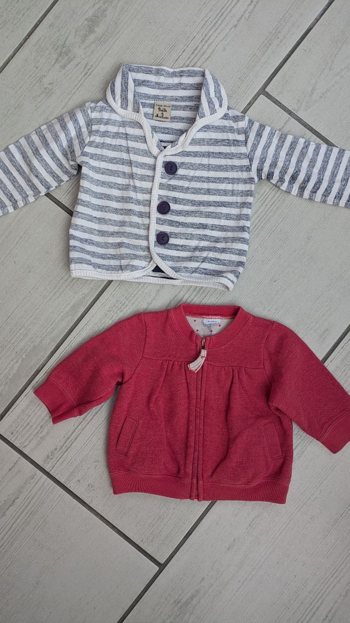 1 gilet rayé très léger et 1 gilet zippé épais en très bon état taille 3 mois