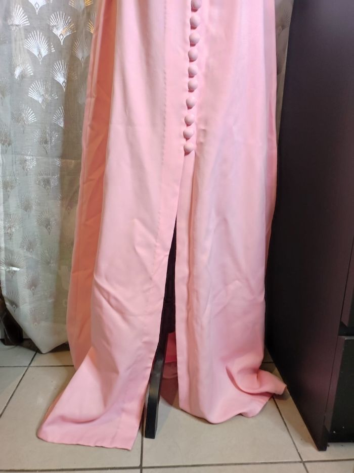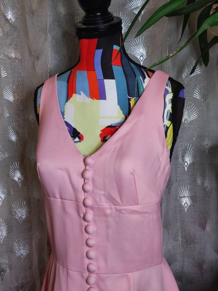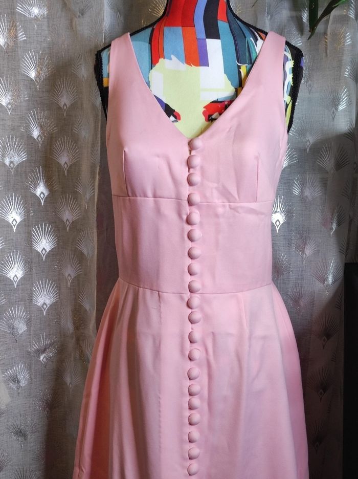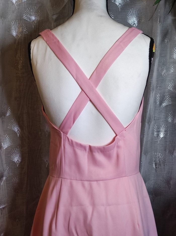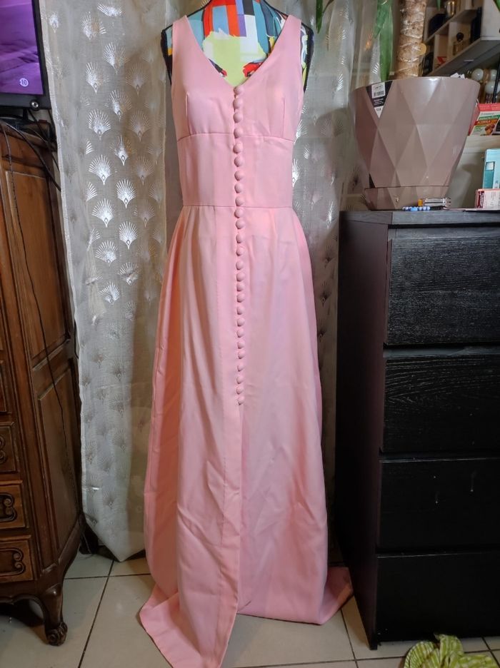 superbe robe longue des années 70. A bretelles croisées a l'arrière et attache a boutons a l'avant, avec coque en tulle dure pour la poitrine. Couleur d'un beau rose poudré. Mesures sous la poitrine de 36 cm et 34 cm a la taille. Jamais porter Cette robe a été créé par ma tante mais jamais portée.