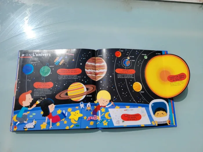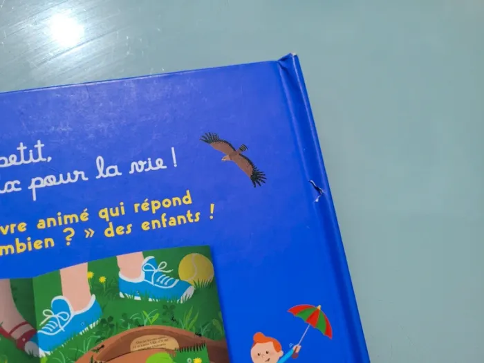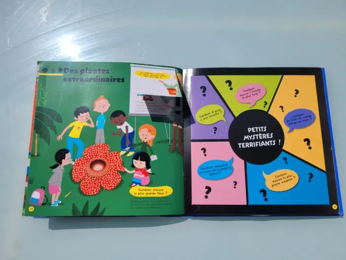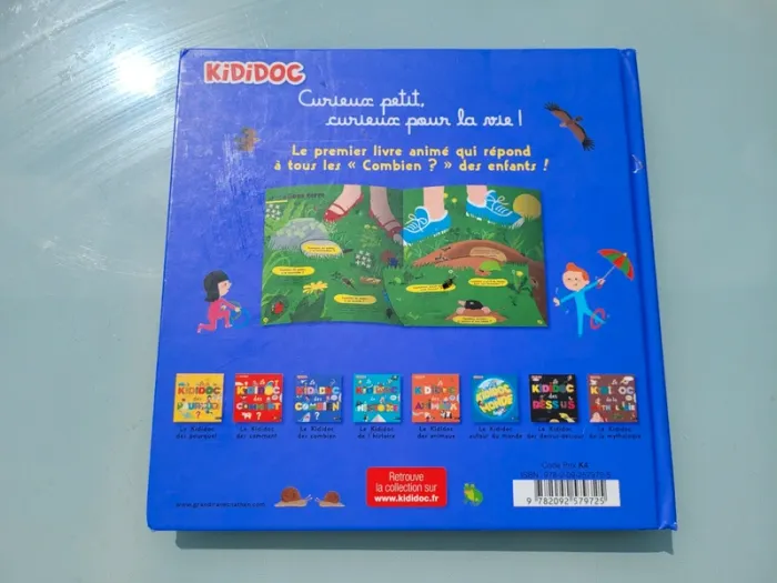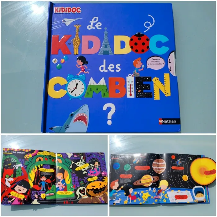 KIDIDOC GRAND FORMAT LE KIDIDOC DES COMBIEN ? Le premier livre animé qui répond à toutes les questions qui commencent par "combien ?" + 80 questions d'enfants pour découvrir des chiffres étonnants, de l'infiniment petit au très grand, en passant par les records : Combien de cheveux a-t-on sur la tête ? Combien y a-t-il de médailles aux jeux Olympiques ? Combien mesure une dent de tyrannosaure ? Combien mesure le caca de la baleine bleue ? Combien d'eau peut aspirer un éléphant ? Combien de dents à l'escargot ? Combien de pattes a le mille pattes ? Combien mesure le plus grand serpent ? Combien d'années vit un chien ? Combien d'eau y a-t-il dans la mer ? Combien mesure le plus grand pays ? Combien de bébés naissent chaque jour ? Combien de planètes tournent autour du soleil ? et à la fin : un grand quiz rigolo ! Dimensions 23.9 x 2.6 x 24 cm Un tout petit accroc sur la tranche (cf photo) et un coin un peu usé sinon en très bon état Mes autres kididocs : #kididocmooglou Mes autres livres enfants : #livreenfantmooglou