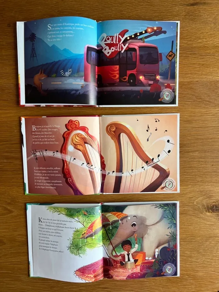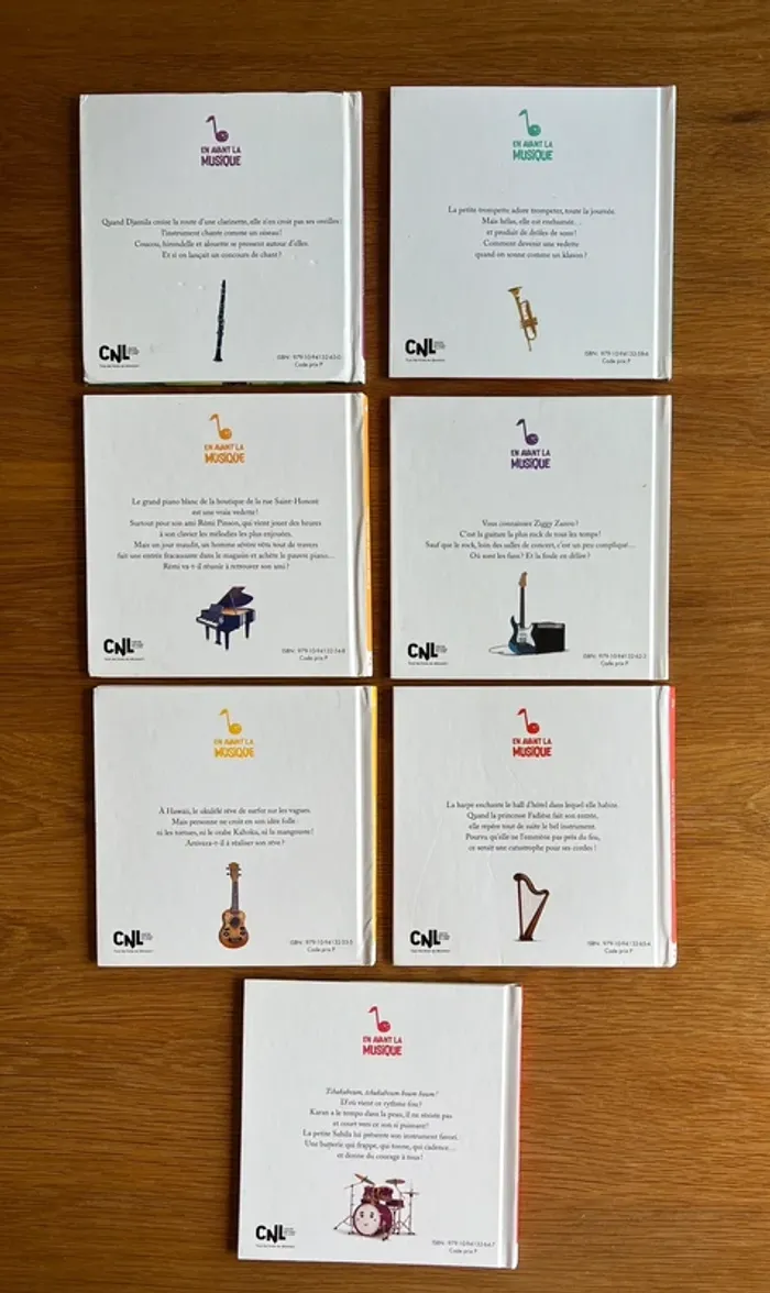 Lot de 7 livres Mac Donald collection En avant la musique : - concerto pour harpe, chat et poney - Ziggy, Zazou Guitare star ! - la batterie de Karan - il faut sauver le piano blanc blanc - le ukulélé qui voulait surfer - la clarinette qui parlait aux oiseaux(1 page légèrement déchirée / voir photo) - la trompette enrhumée Catégorie : #alexiap30livres
