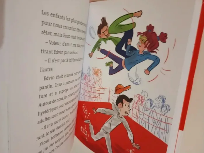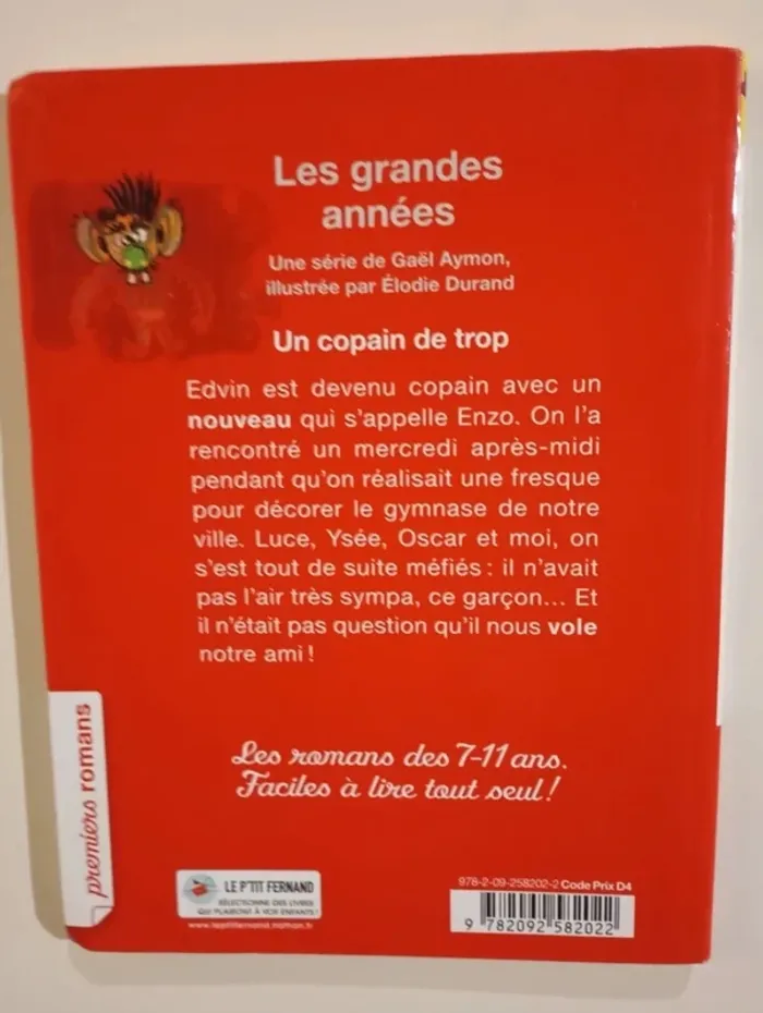 Ness, Oscar, Ysée et Luce sont en alerte : Edvin a sympathisé avec un nouveau qui s'appelle Vadim. Il n'y en a bientôt que pour lui : Vadim dessine trop bien, Vadim a des jeux trop cools, Vadim a un super appartement... Sauf que Vadim les ignore et ne semble s'intéresser qu'à Edvin qui, peu à peu, se détourne de ses copains. Il faut vite agir contre ce voleur d'ami ! Éditeur ‏ : ‎ Nathan 64 pages Âge de lecture ‏ : ‎ 7 - 9 ans Dimensions ‏ : ‎ 14.6 x 1.1 x 19.2 cm Livre en parfait état je vends d'autres livres de la même collection #phil_peg_premiersromans #premiersromans #école #copain