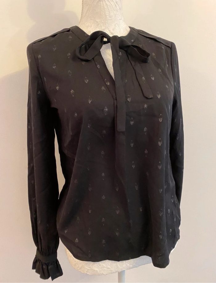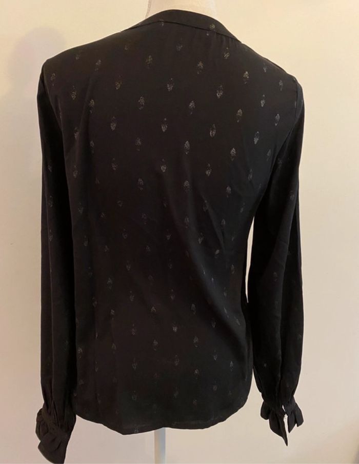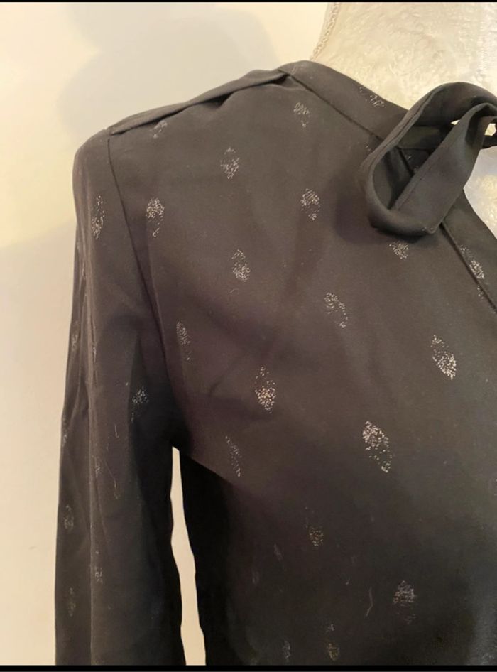 👕Taille S = 36 🧼 Très bon état - peu porté 📍 Marque Vero Moda 👕 Couleur : noir 🔖 blouse noir avec motif argenté , flot à nouer, élastique aux manches 💯 idéal pour un look chic et décontracté