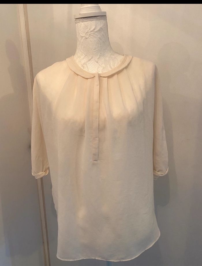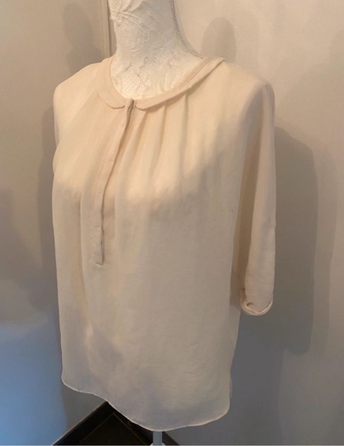 👕Taille S = 36 🧼 Très bon état - peu porté 📍 Marque : Zara 🎨Couleur : crème ✅ Col claudine ,Tissu transparent ,Manche 3/4 💯 idéal pour un look chic