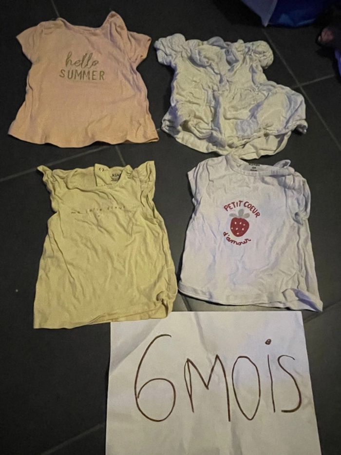 Lot de 4 tee shirts manches courtes pour bébé fille en taille 6 mois de la marque Kiabi en parfait état sauf un tee shirt qui comporte une petite marque peu visible de transfert sur la troisième photo Le lot comporte un tee shirt abricot « Hello Summer », un autre jaune avec écrit «ma jolie fleur», un chemisier léger jaune et blanc motif fraise « petit cœur d’amour » ➡️ Cliquez ici pour retrouver mon dressing pour bébé en 6 mois: #captieusebebe6mois