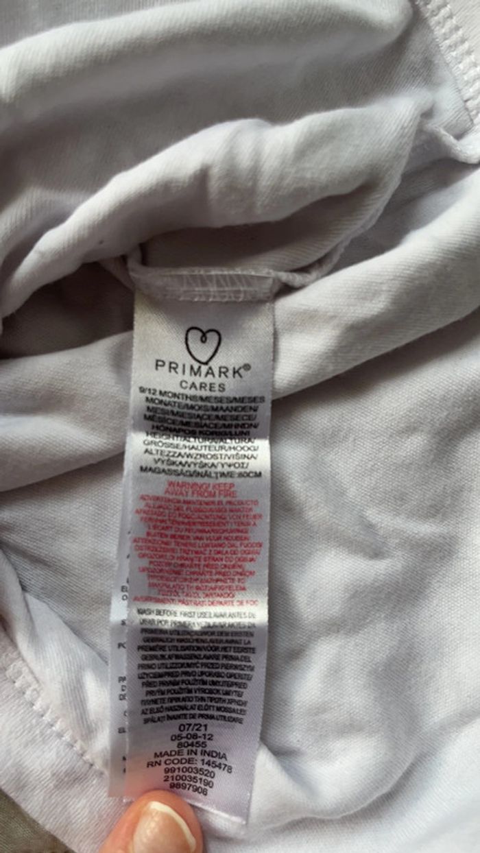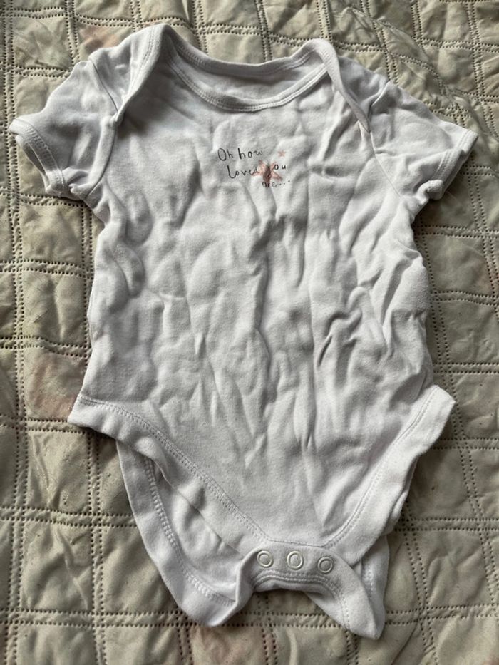 Body Primark blanc en bon état en taille 9-12 mois avec inscription « Oh how loved you are » avec 2 étoiles roses
