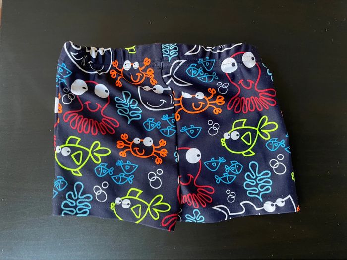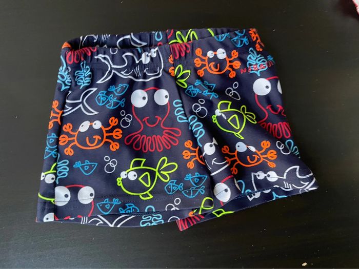 Short de bain/ maillot de bain bleu foncé avec des crabes, des poissons et des pieuvres acheté à Décathlon, taille 18 mois. Il n’y a cependant plus d’étiquette. Parfait pour la piscine ou la mer. Excellent état