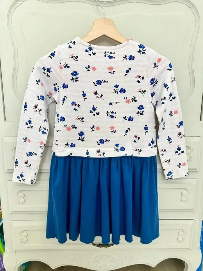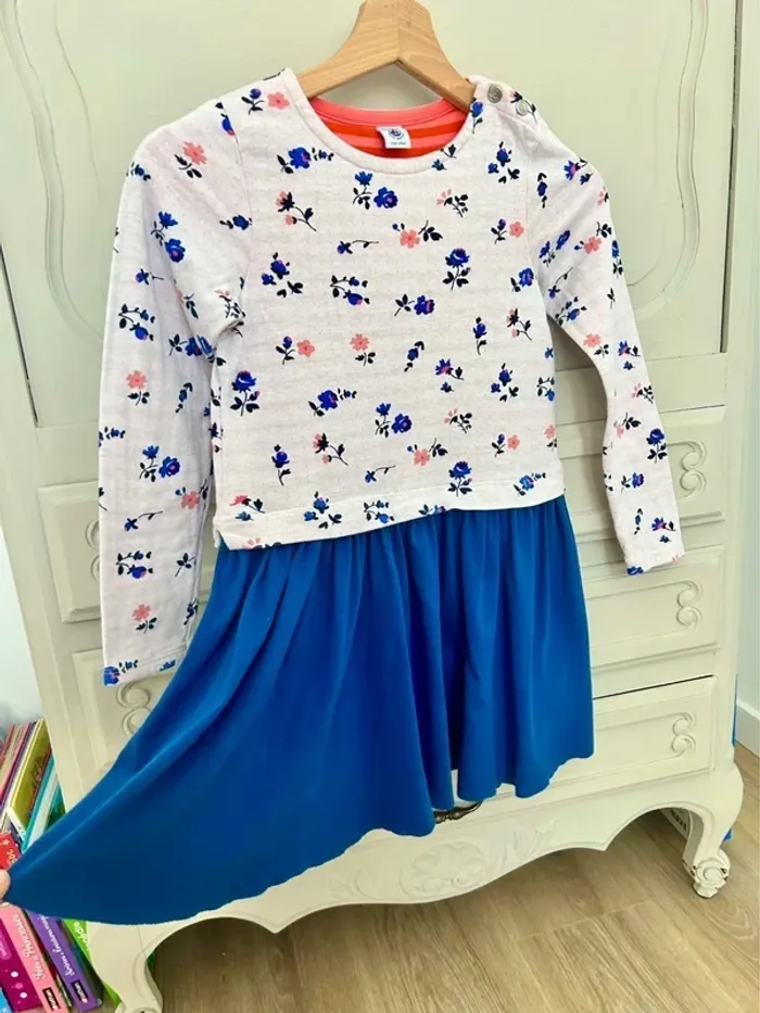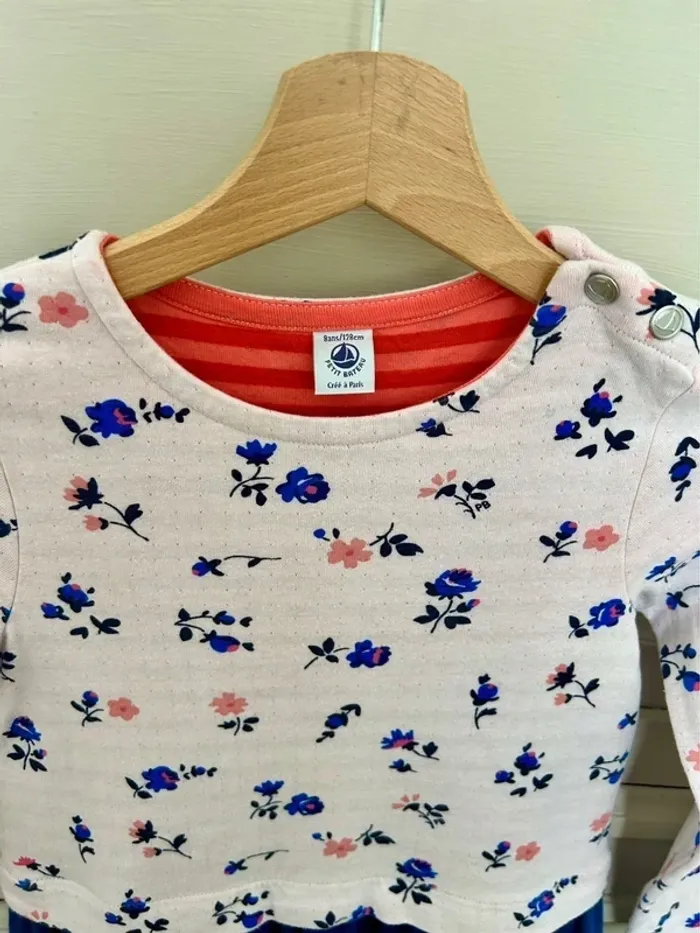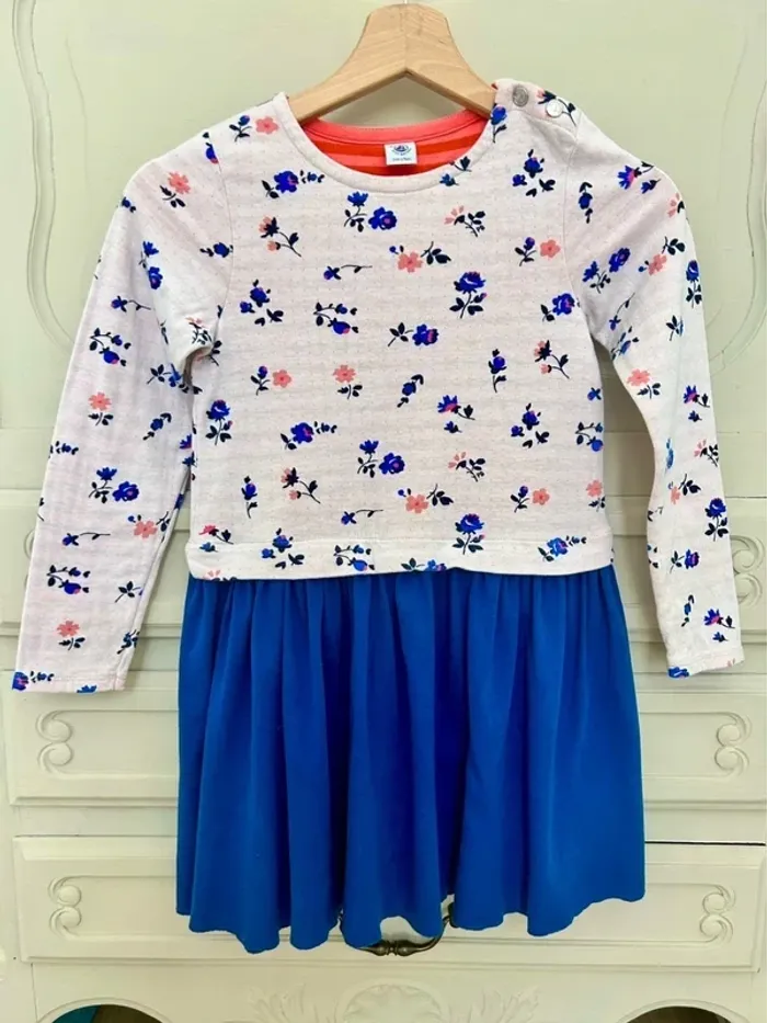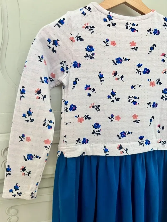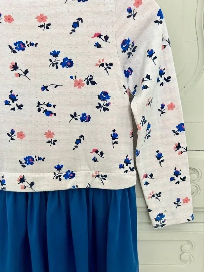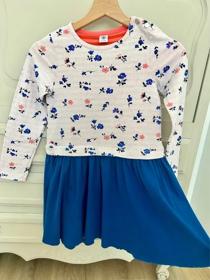 Ravissante robe manches longues avec motif fleurs Acheté chez petit bateau Taille : 8 ans Couleur : bleu en bas , rose clair en haut avec fleurs État : très bon état, très légères marques en bout de manches cf photos