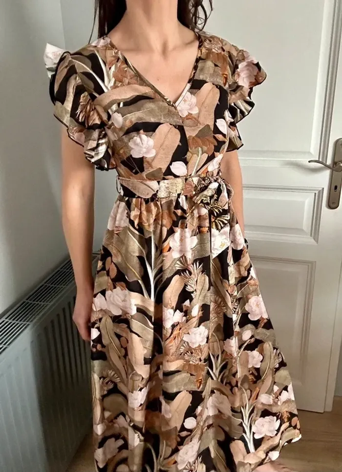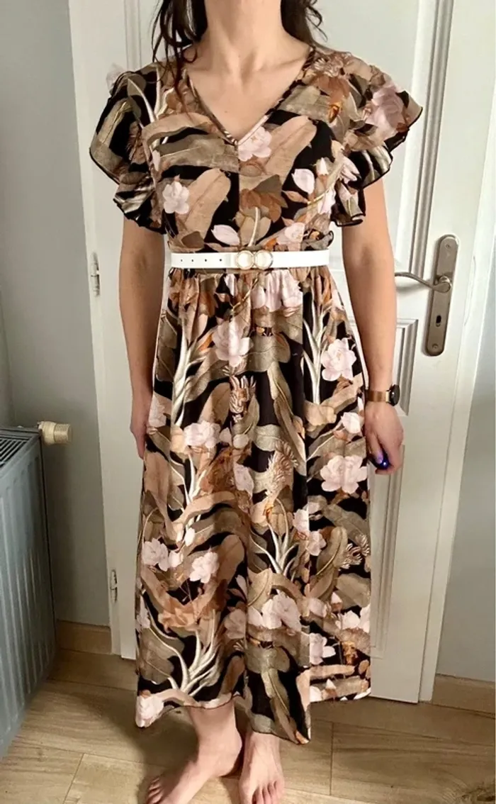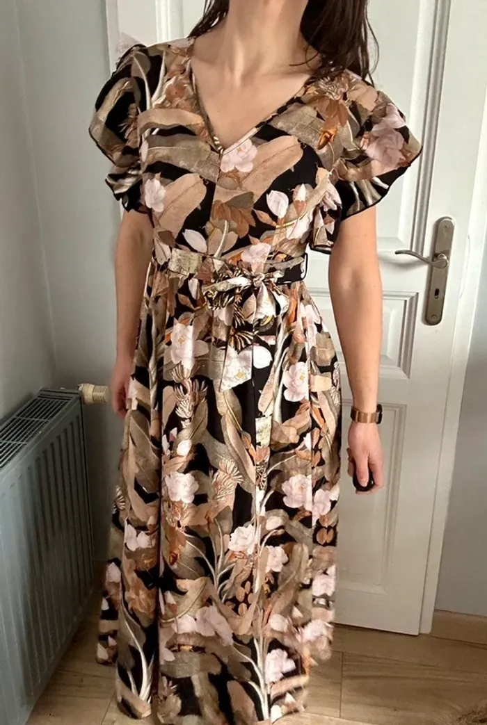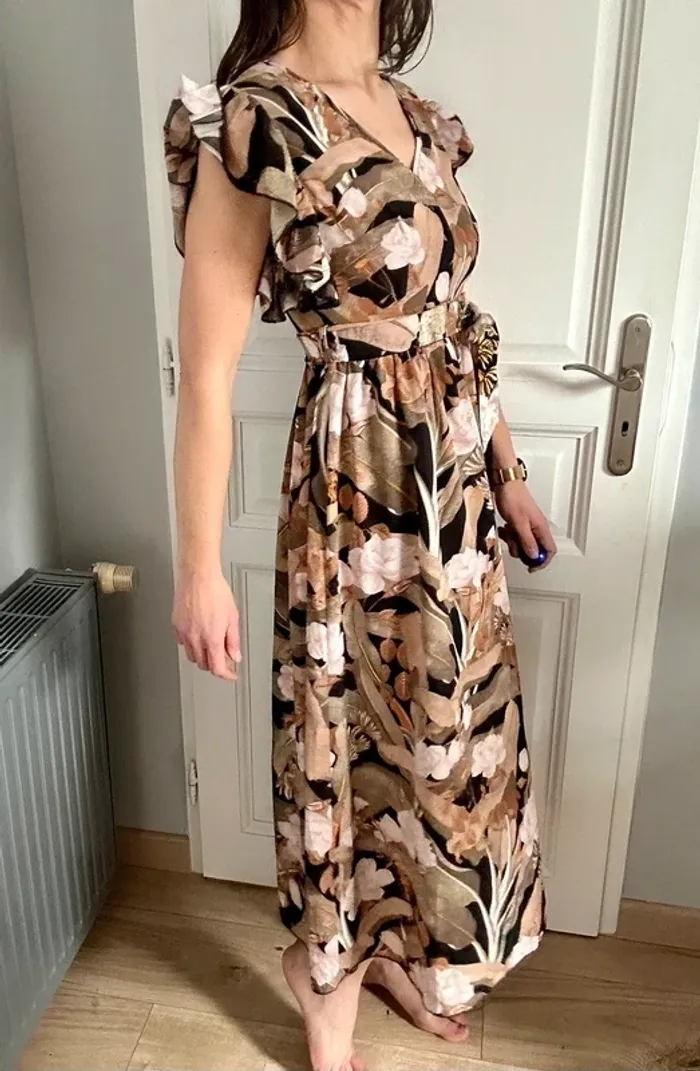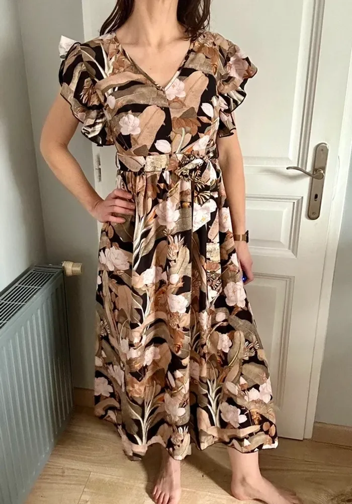 Superbe robe fluide et élégante à imprimé floral camel, beige et rose poudré - photo numéro 1