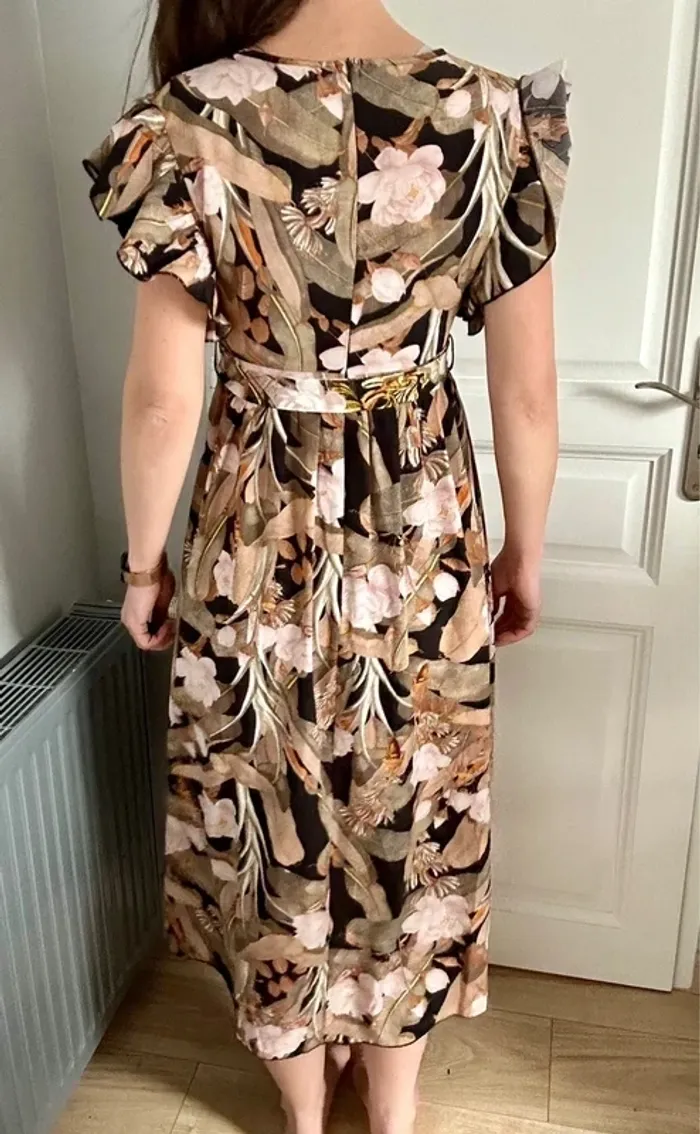 Superbe robe fluide et élégante à imprimé floral camel, beige et rose poudré - photo numéro 3
