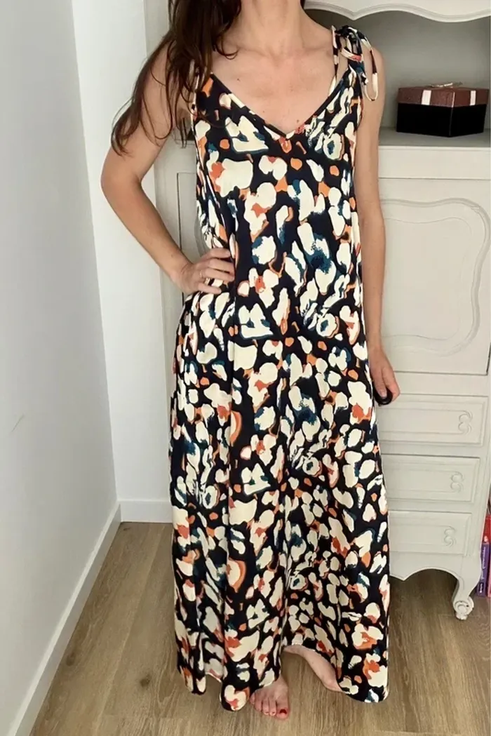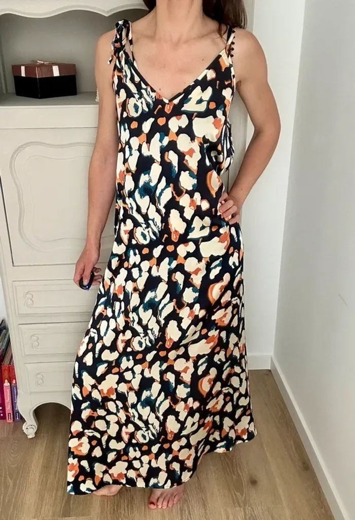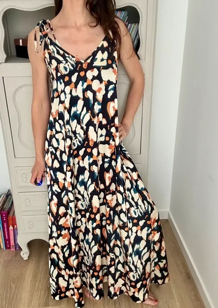 Superbe robe à motif , décolleté en V , longue et fluide Marque : Ikoone et Bianka Couleur blanc crème , bleu et orange Taille : 36 , S , 1 // 38 , M , 2 État : parfait état