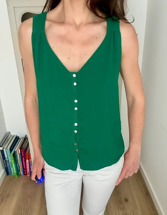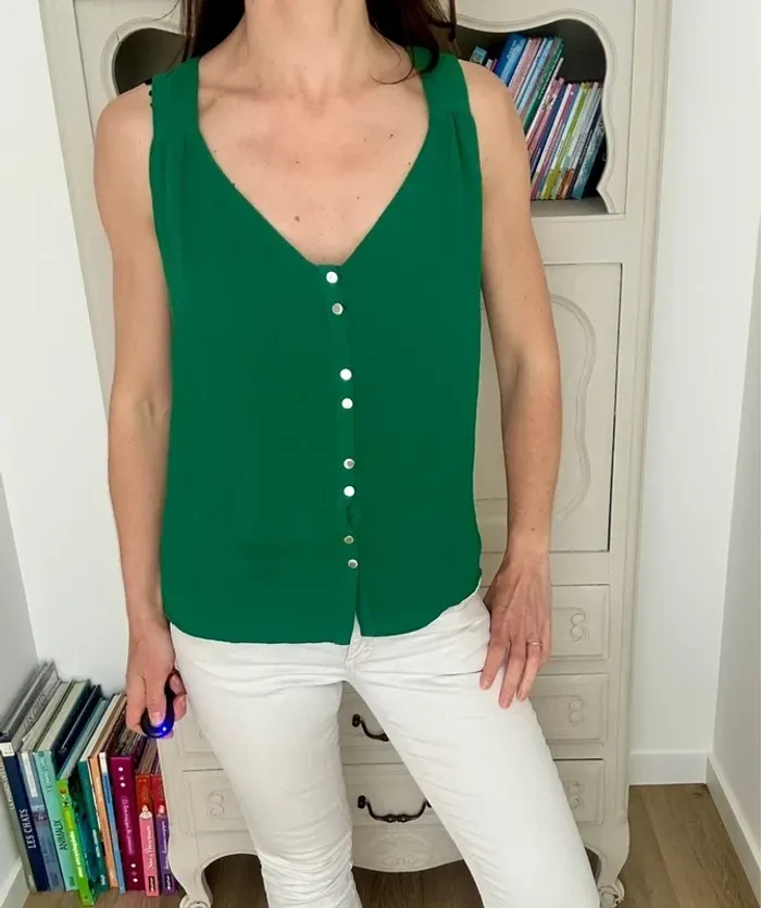 Ravissant petit haut , top fluide avec boutons sur le devant Marque : Morgan Couleur vert Taille : 36 , S , 1 Etat : excellent état