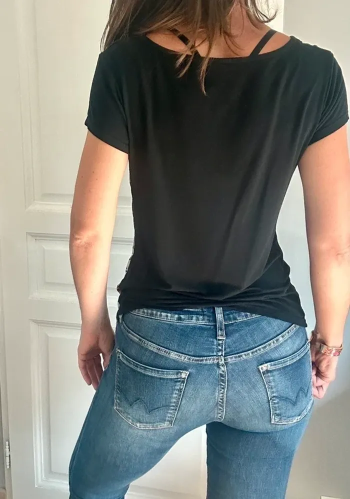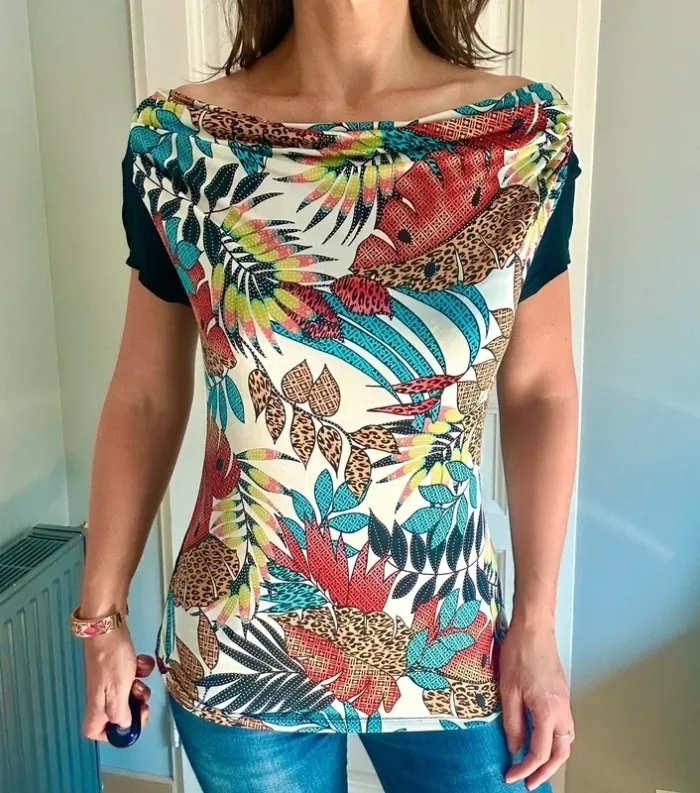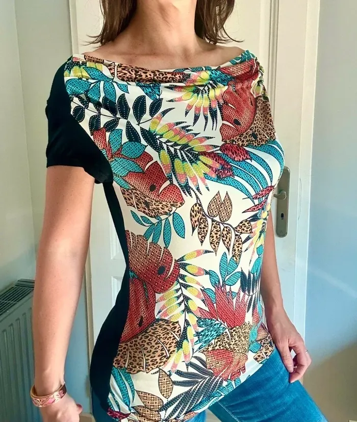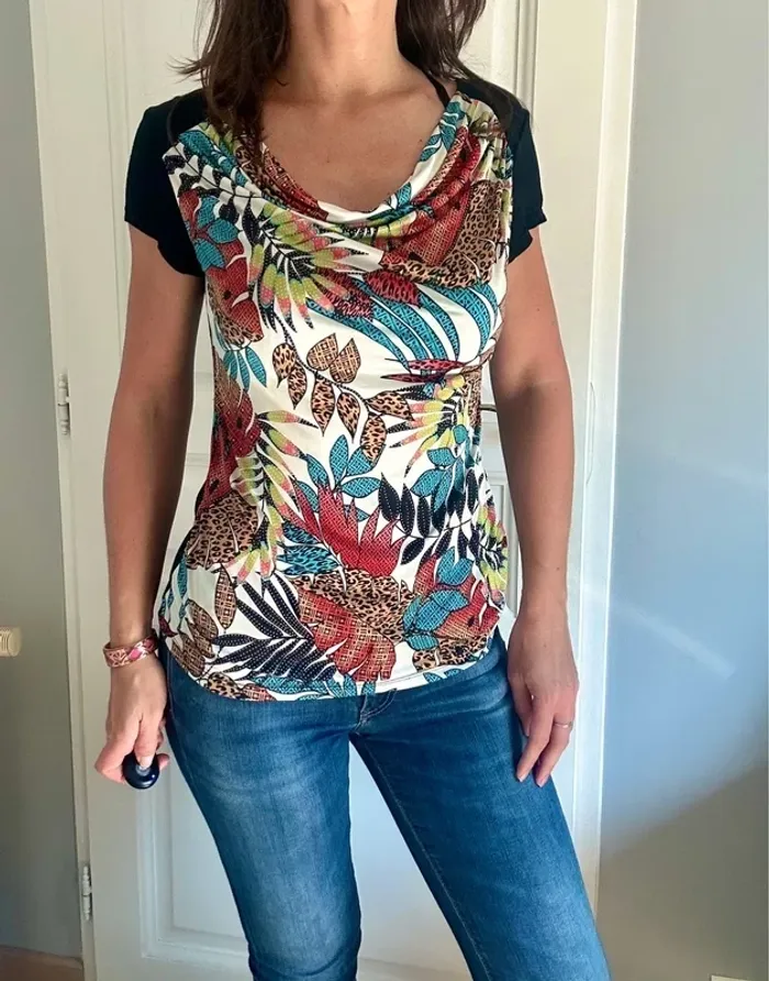 Ravissante blouse col bénitier – imprimé floral multicolore 🌺 • Coupe : col bénitier, manches courtes • Devant : jersey fluide imprimé fleurs & feuillages tropicaux (rouge, bleu, vert, léo, écru…) • Dos : uni noir, matière soyeuse très agréable à porter • Taille : 36 / S / 1 • État : très bon (couleurs éclatantes, aucun défaut) À associer aussi bien avec un jean qu’un pantalon habillé ! ⸻ #Blouse #ColBenitier #HautFemme #Taille36 #TailleS #ImpriméFleurs #Multicolore #DosNoir #LookDuJour #VintedFind #SecondeMain #FashionAddict