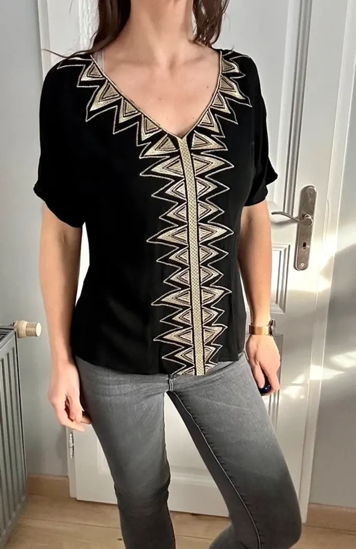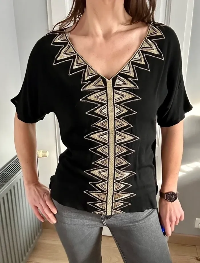 Très belle blouse Molly Bracken – noir motif doré, coupe fluide - photo numéro 1
