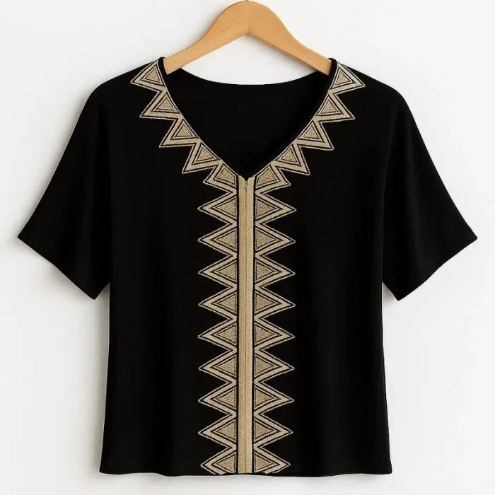 Très belle blouse Molly Bracken – noir motif doré, coupe fluide