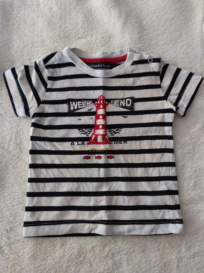 T-shirt marinière un weekend à la mer Taille 6 mois Un weekend à la mer Ouverture au col Porté 1 ou 2 fois Pas de tâches ni trou 🎁 Un cadeau offert pour toute commande + un cadeau supplémentaire par tranche de 10€ d'achat (hors frais de protection et frais de port)