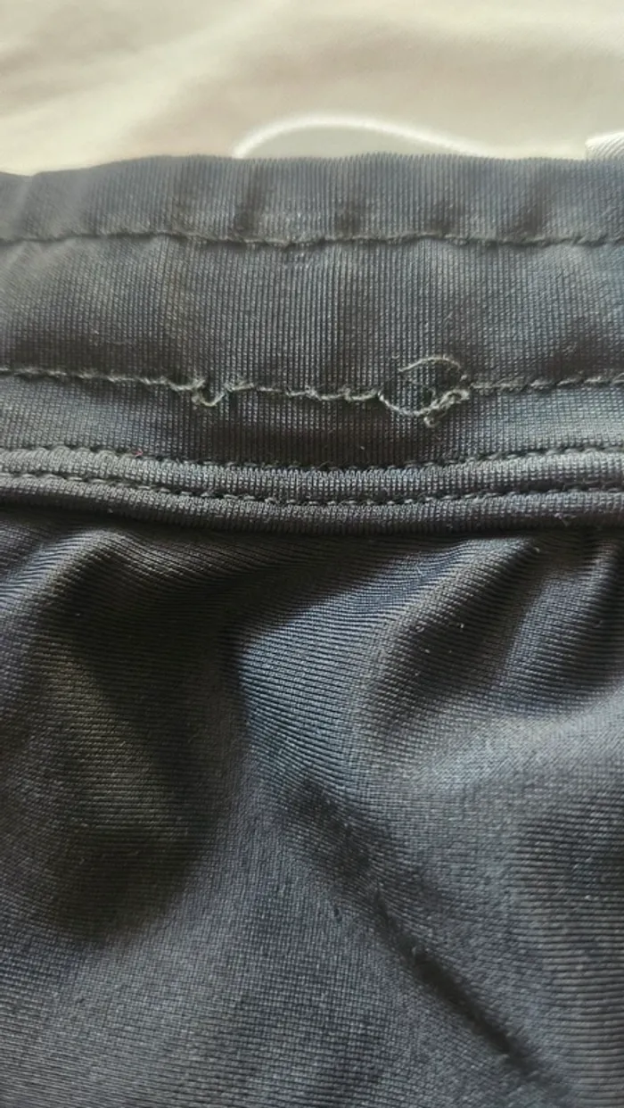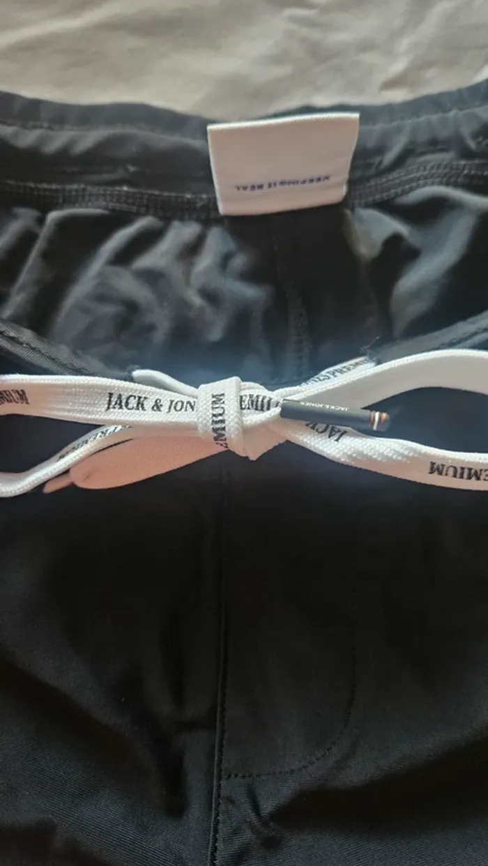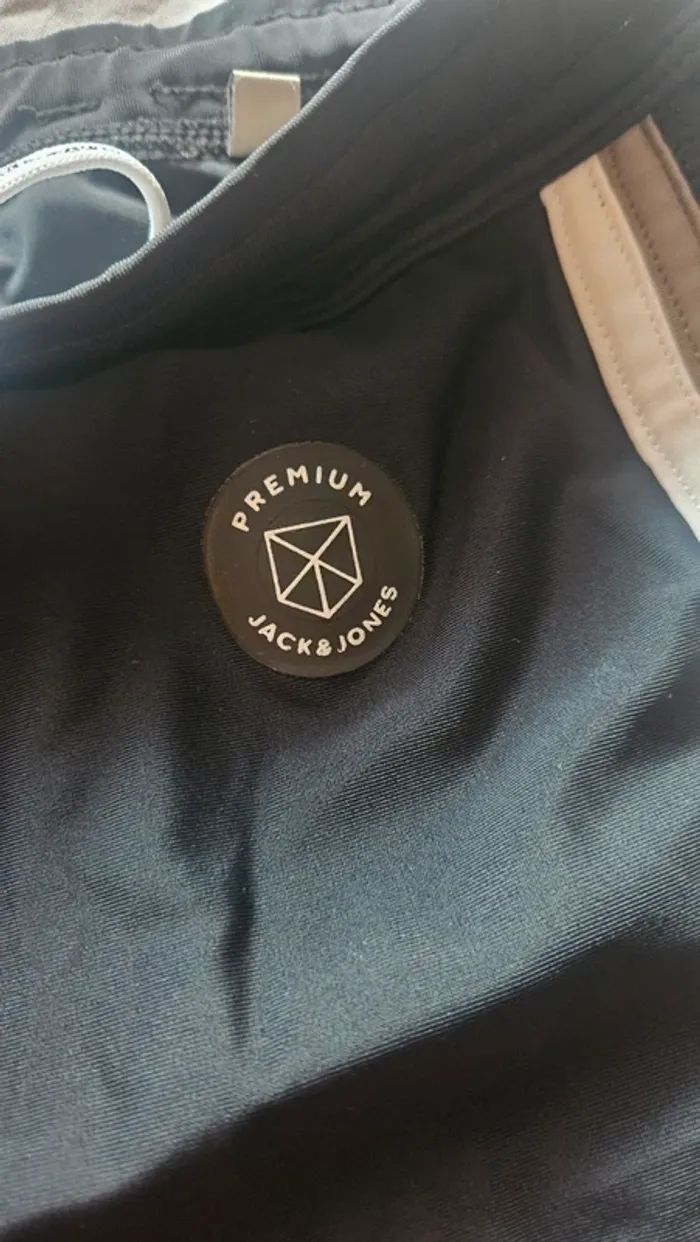 Short de bain Jack & Jones Premium pour homme, taille S. Coloris noir avec bandes latérales blanches et grises pour un style sport élégant. Logo Premium Jack & Jones sur la cuisse, cordon de serrage blanc marqué Jack & Jones. Tissu léger et séchage rapide, parfait pour la plage ou la piscine. En bon état général, petites traces d’usure légères à la couture (voir photo), sans incidence sur le port ou le confort. #vanessavadhommes #shortdebain #jackandjones #homme #tailles #modehomme #beachwear #swimwear #sportswear #shortnoir #vintedhomme