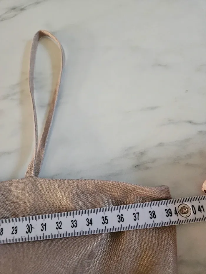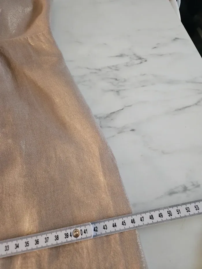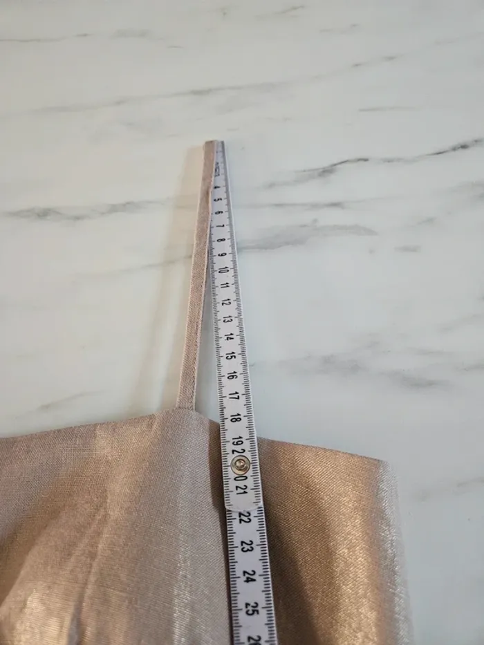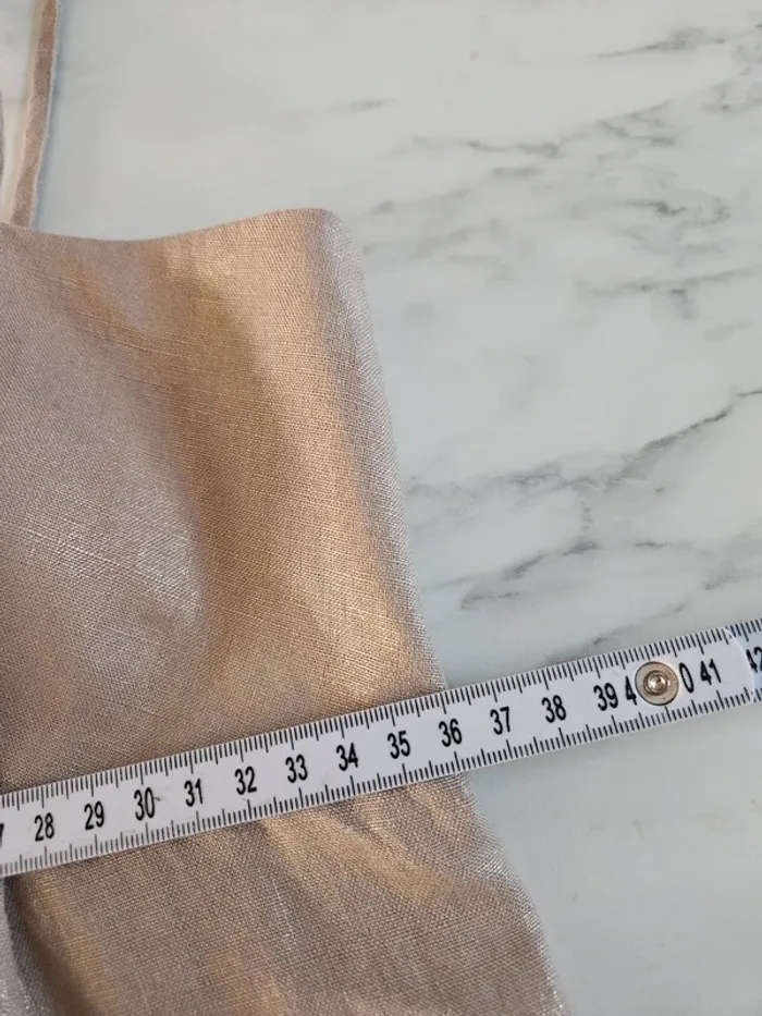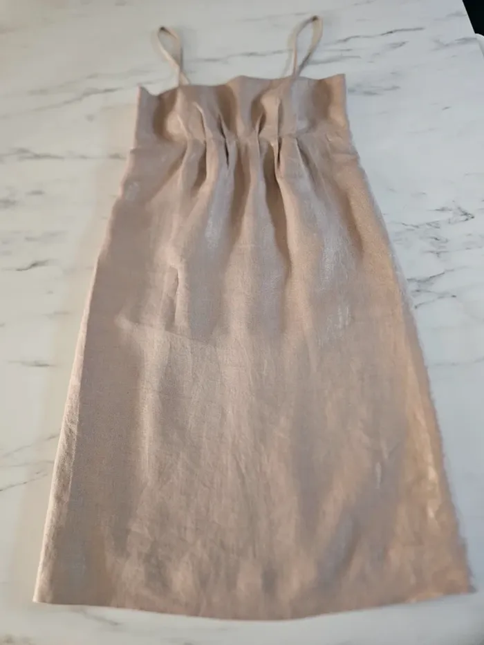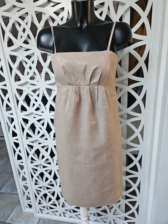 Robe style chasuble beige à reflets doré nacré. Elle est en parfait état. Mon mannequin est un 38 c'est pour cela que la tirette n'est pas fermée. Toute les dimensions se trouvent sur les photos prenez le temps de les vérifier 😊