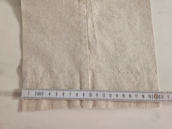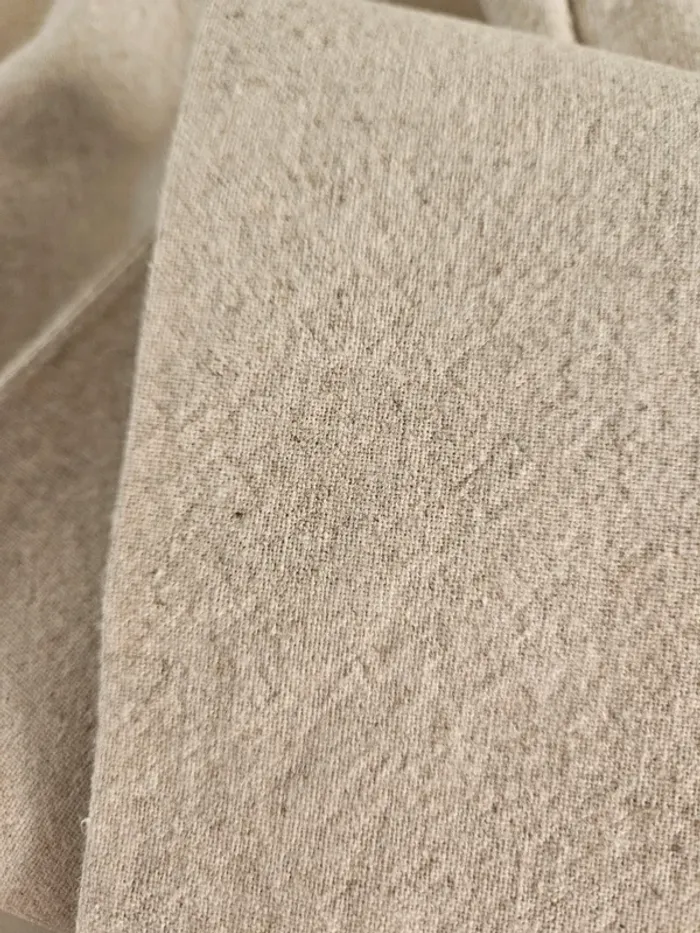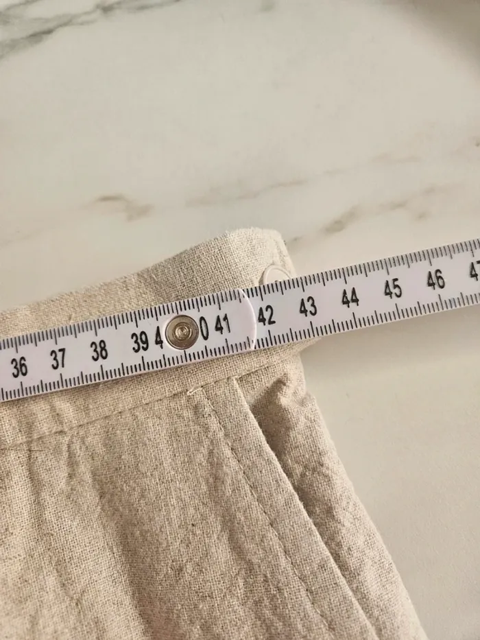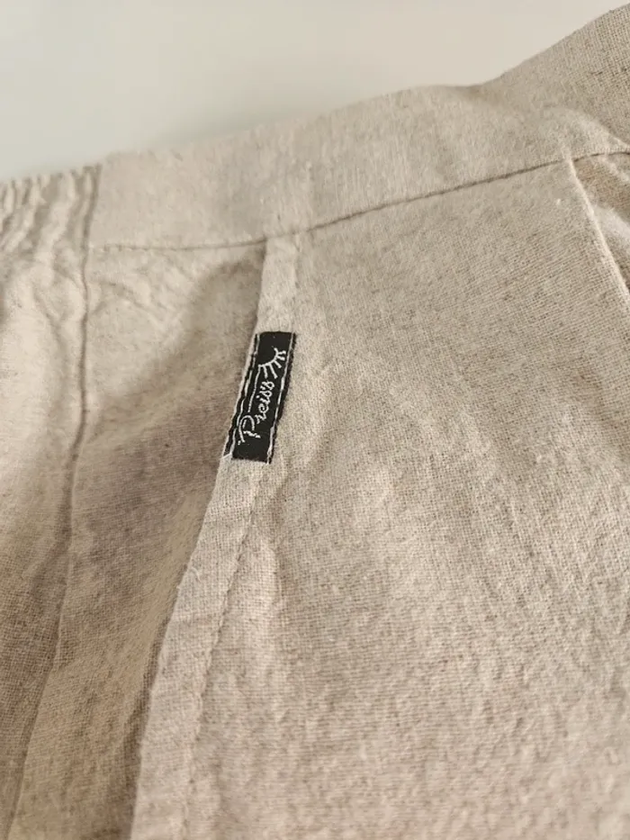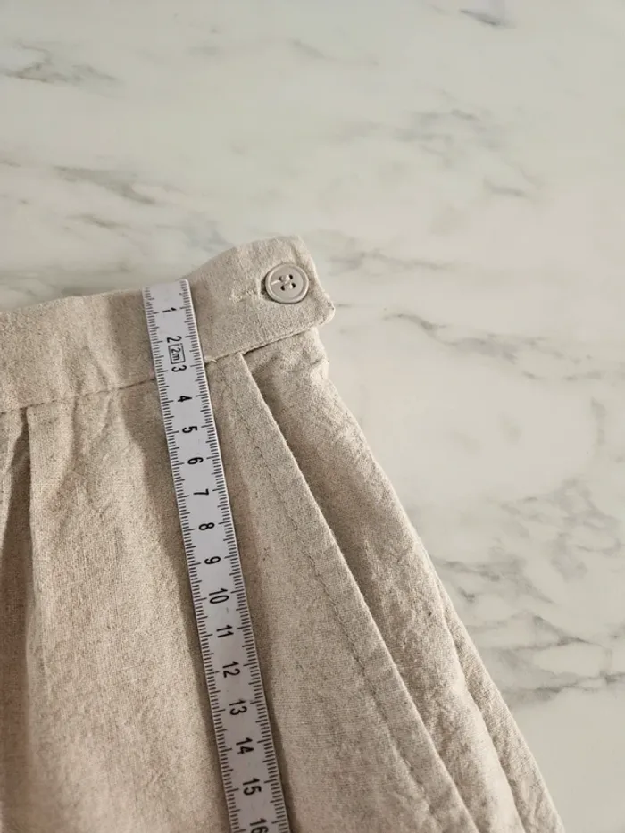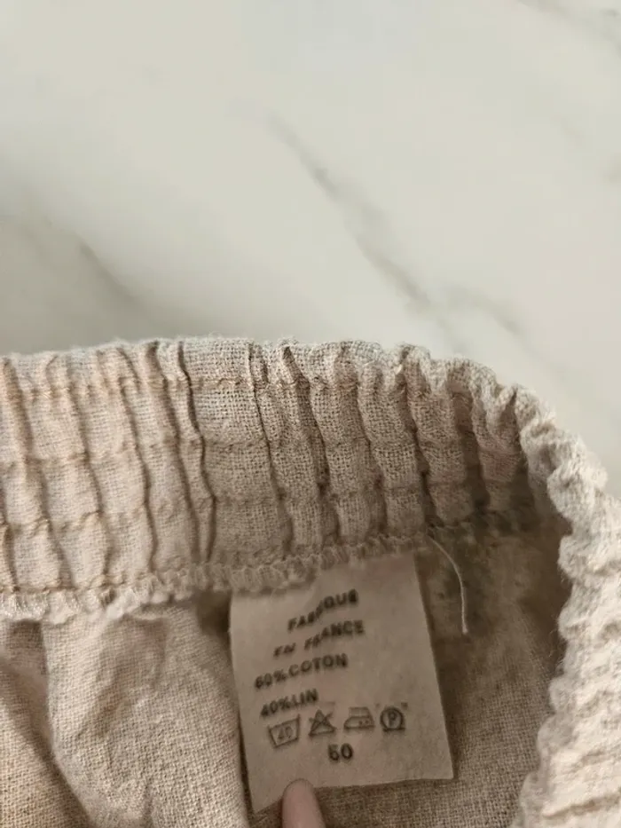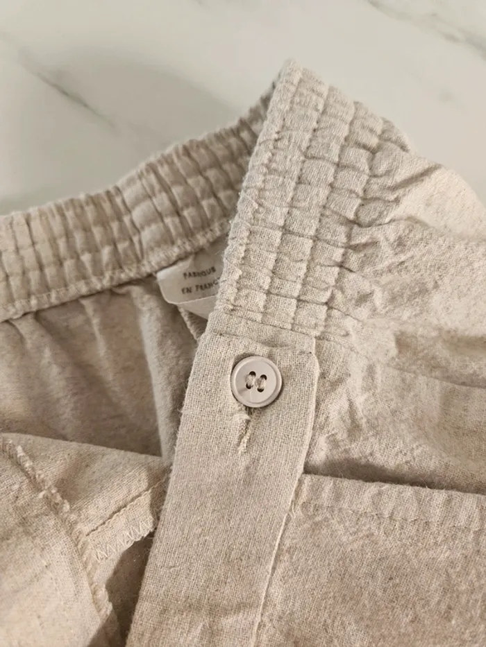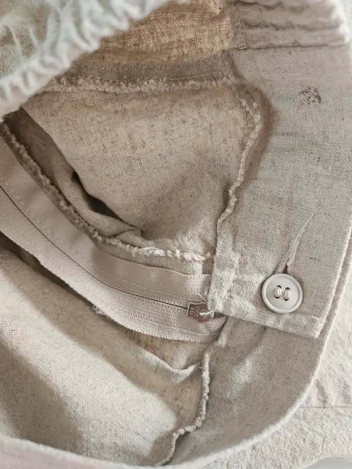 De couleur beige moucheté. Lin et coton mais il a vraiment l'aspect du lin. Porté mais il reste en très bon état. Taille extensible et fermeture par boutons et tirette sur le côté. Dimensions sur les photos