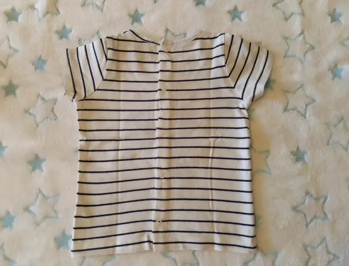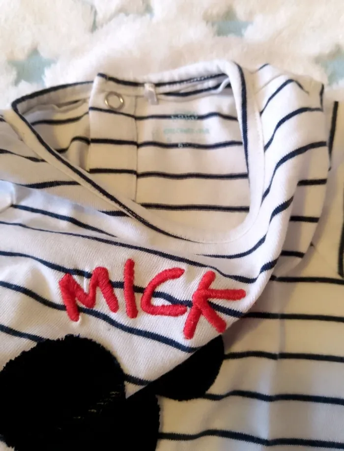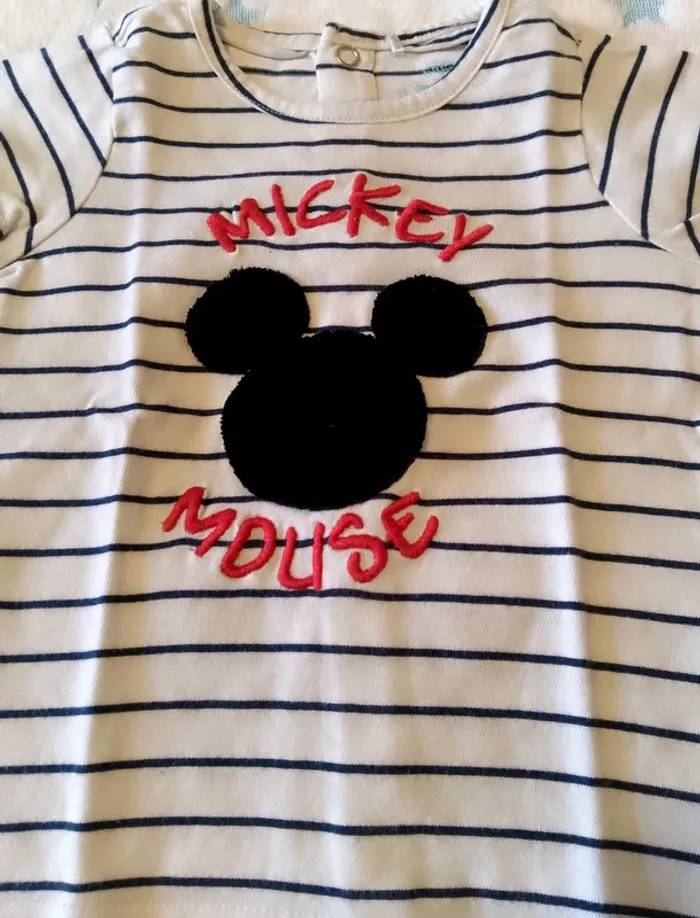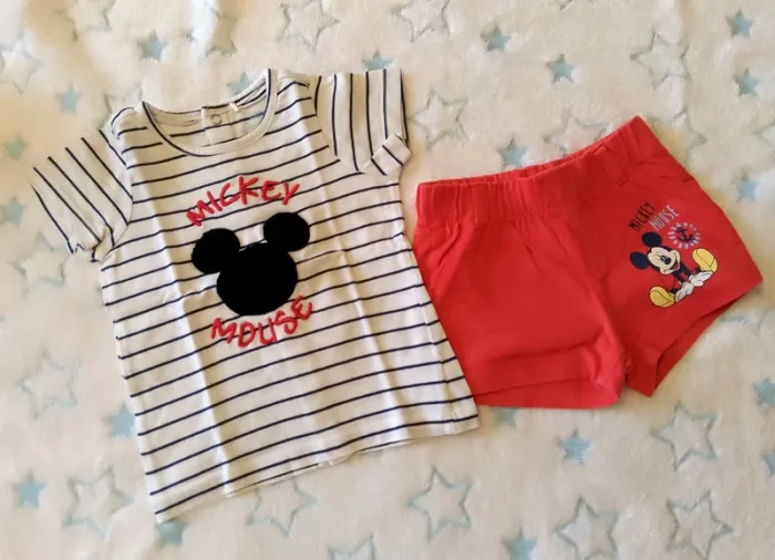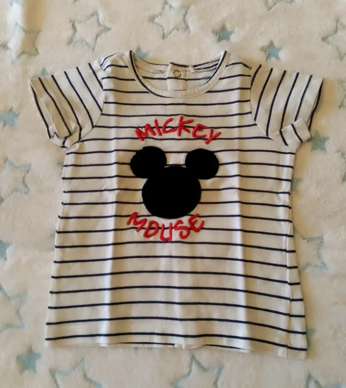 Tee-shirt Mickey Disney Baby Orchestra 6M. Donne avec : un short mickey Disney Baby 6M tâche a l'arrière du short voir dernière photo.
