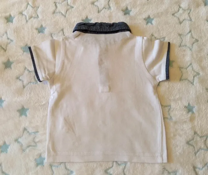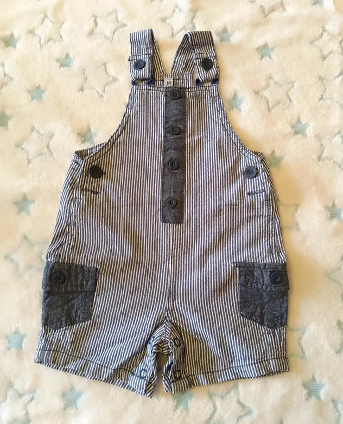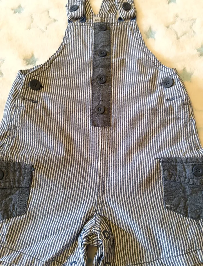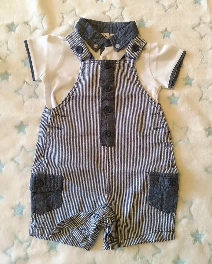 Ensemble salopette short et tee-shirt avec col, 6M, très peu porté. 100% coton pour la salopette Coton et polyester pour le tee-shirt.