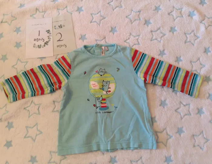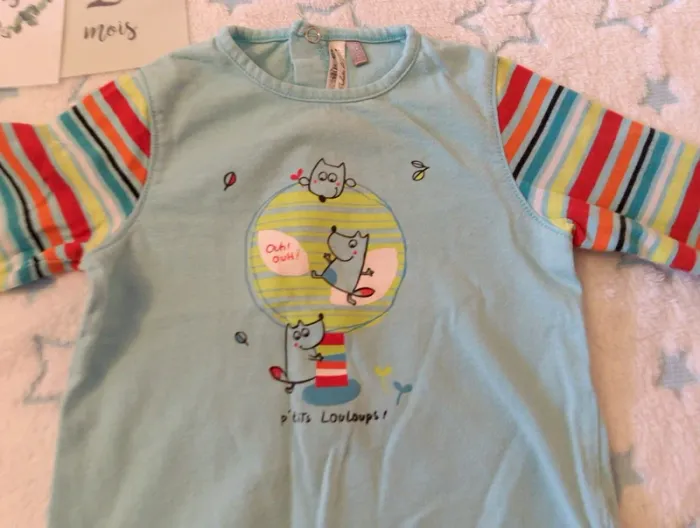 Tee-shirt manches longues orchestra bébé 12M/74cm motif p'tits louloups. Boutons pression au dos. Peu porté.