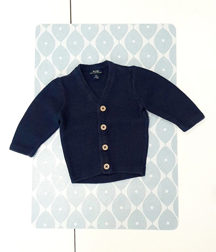 Ensemble Kiabi avec gilet marine, haut ML jaune moutarde, salopette courte grise et t-shirt - Taille 1 mois