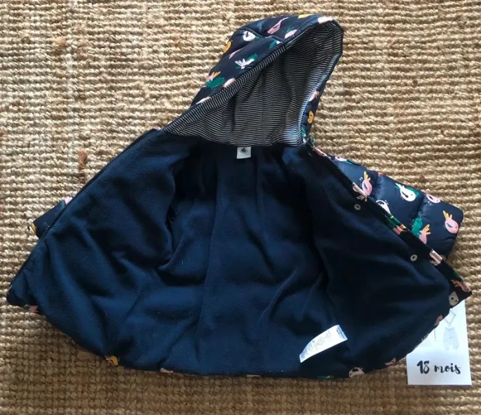 Doudoune imprimée de petits oiseaux avec capuche. Corps doublé en micropolaire pour plus de chaleur et manches doublées en polyamide pour faciliter l'habillage. Ouverture zippée et pressionnée sur le devant de la doudoune. 👀 Autres articles 18 mois : #walinga_18mois