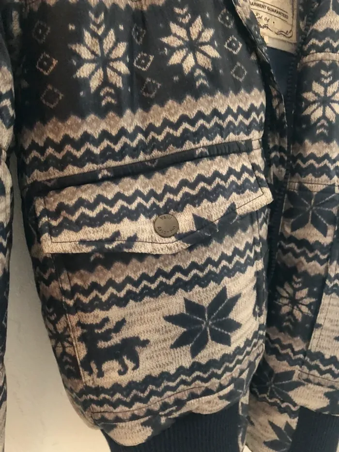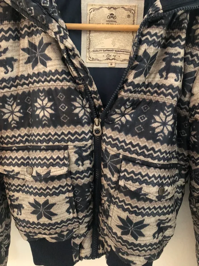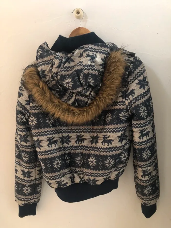 Très joli mais malheureusement trop petit pour moi Neuf et jamais porté 2 poches à l’avant Fermeture zippée Capuche amovible avec fausse fourrure Idéal pour la saison actuelle