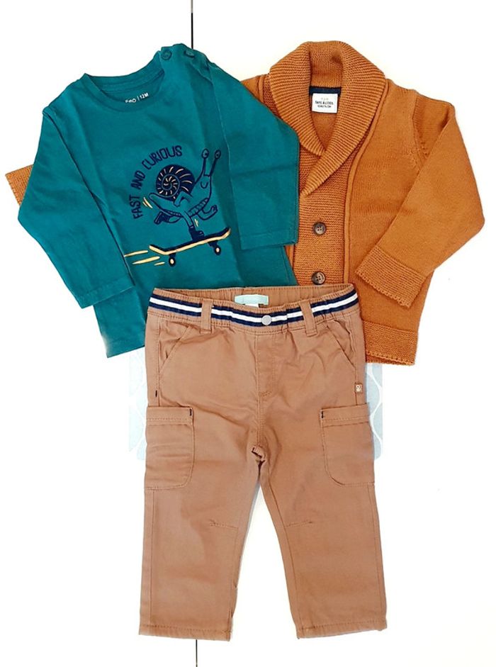Ensemble avec gilet moutarde Tape a l'oeil, haut ML Gemo et pantalon beige Obaibi - Taille 12 mois