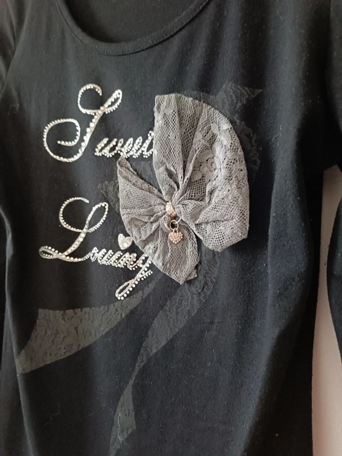 T-shirt manches longues noir avec détails en gris. Beau noeud en dentelle avec strass Taille unique Neuf #clau_d1a_hiver #clau_d1a_pull 📨 Envoi rapide et en petit format ⛔ Je n'accepte pas les retours, échanges ou remboursements. Merci de revendre l'article si celui-ci ne vous plaît/convient pas