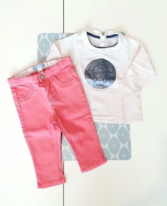 Ensemble Obaibi avec jeans et haut ML blanc col claudine - Taille 12 mois