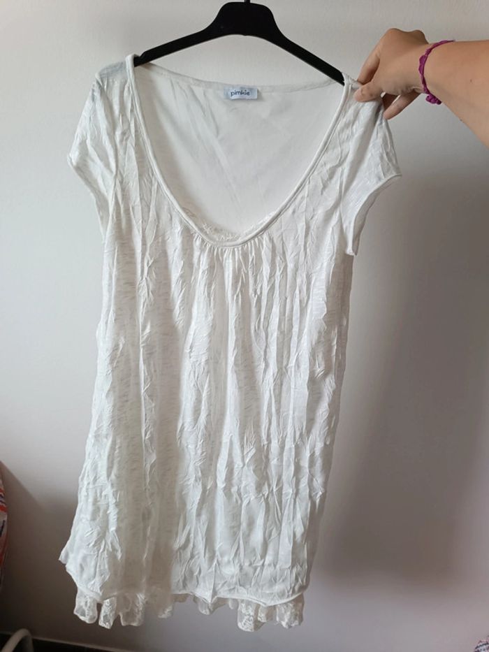 Tunique blanche en dentelle, manches courtes, encolure légèrement en V marque Pimkie Taille M Couleur blanc cassé #clau_d1a #clau_d1a_ete #clau_d1a_taillem #clau_d1a_plage 🧼 Lavé avant la mise en vente ⛔ Je n'accepte pas d'éventuels retours. Si l'article ne vous plaît pas, merci de le revendre ⛔ ✅ Envoi rapide et soigné, en petit format