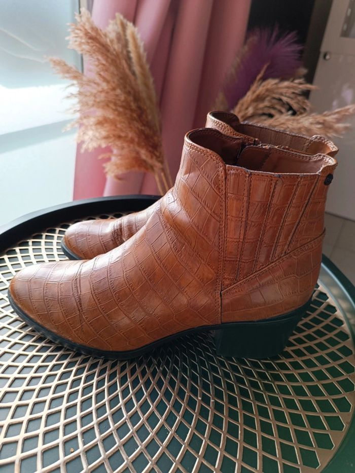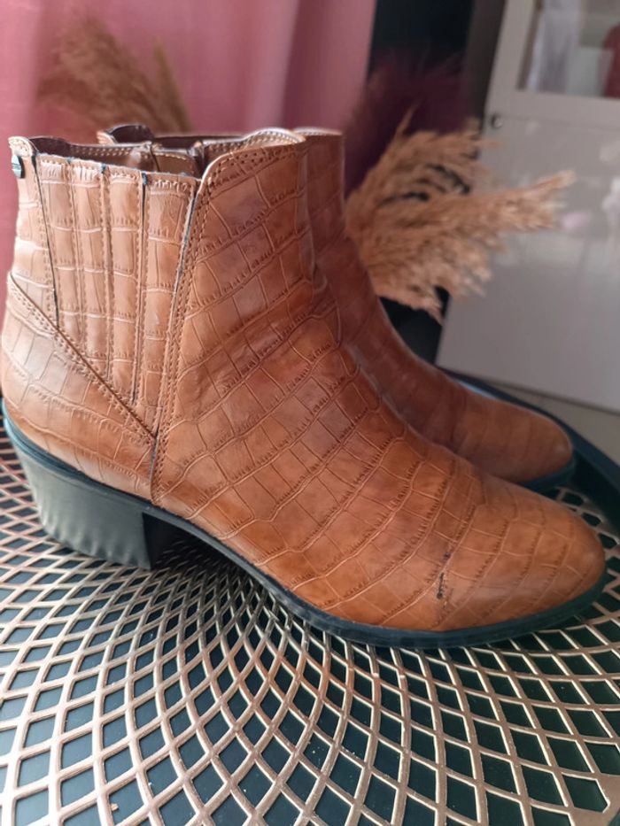 Bottines de la marque ESPRIT pointure 40 Motif croco , couleur marron En CUIR Semelle à mémoire de forme très confortables Font très bien habillées Mises à peines 2x La couleur est un peu partie au niveau du pli mais avec du produit de cirage (que je n'ai pas) on peut réparer. ⚠️Achetées 60€ en magasin, vu leur très bon état j'en souhaite minimum 25€.⚠️ ✅ Envoi rapide, soigné et en petit format -1kg ❌ Je n'accepte pas les retours étant donné que mon annonce et les photos détaillent bien le produit.❌ #clau_d1a_hiver #clau_d1a_chaussures #clau_d1a
