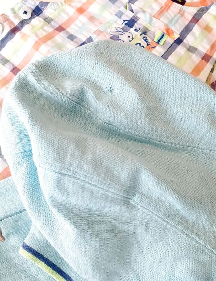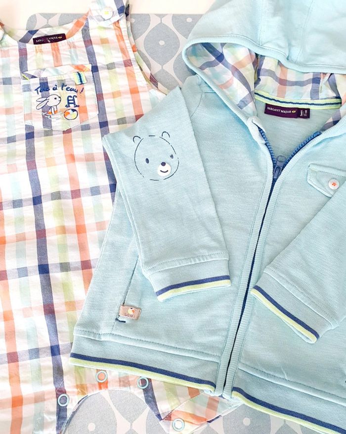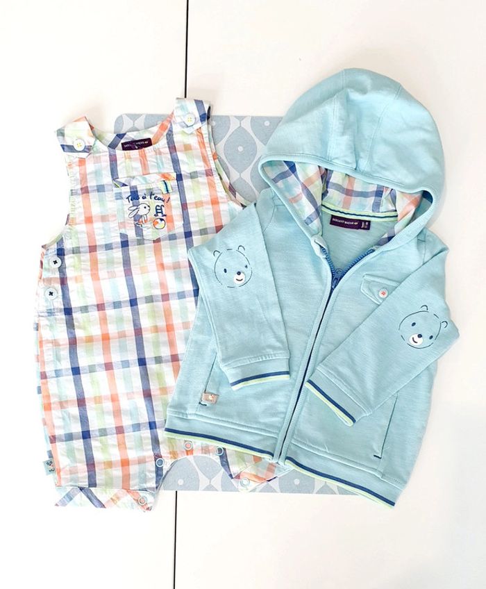 Ensemble Sergent Major avec salopette courte et veste a capuche bleu clair (petit trou, voir photo) - Taille 9 mois
