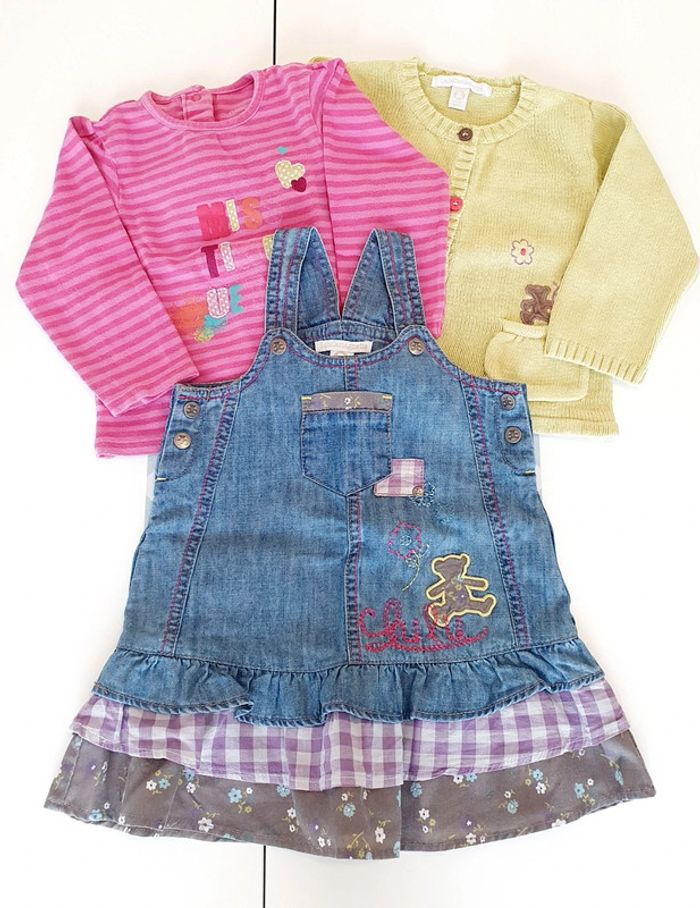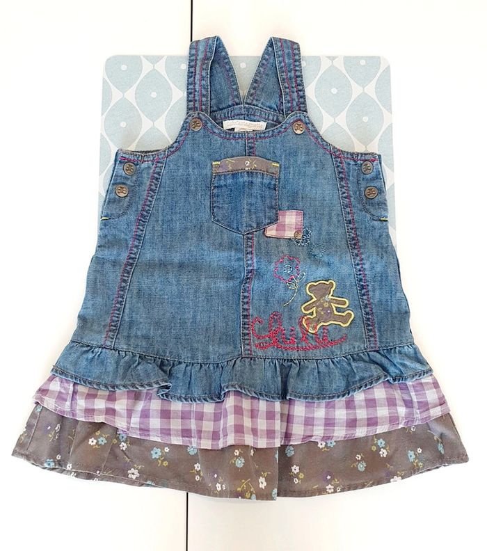 Ensemble robe en jeans et gilet vert pomme Lulu Castagnette + haut ML rose Orchestra - Taille 18 mois