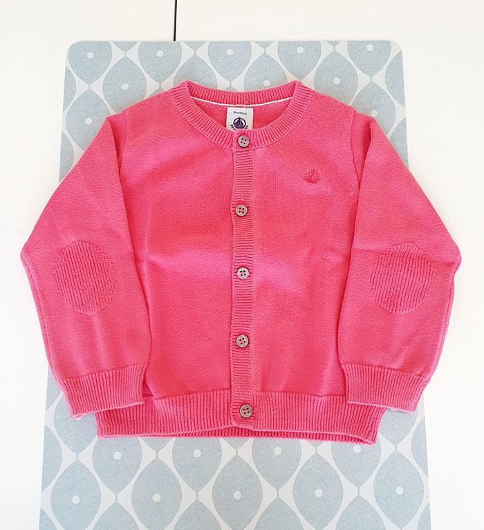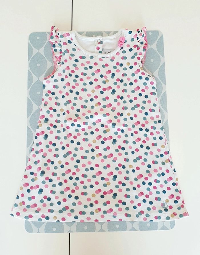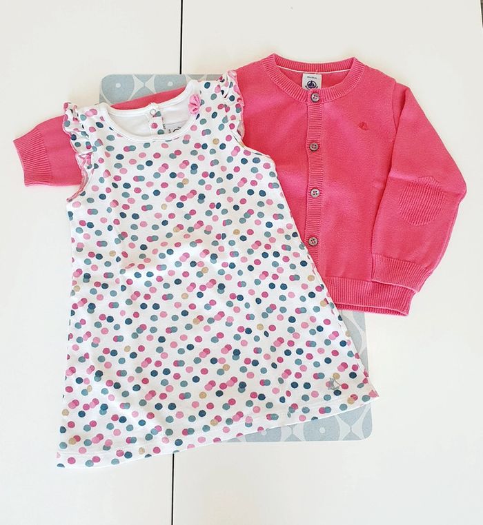 Ensemble Petit Bateau avec robe a pois et gilet rose - Taille 18 mois (petite tache discrete sur le gilet, difficile a photographier)