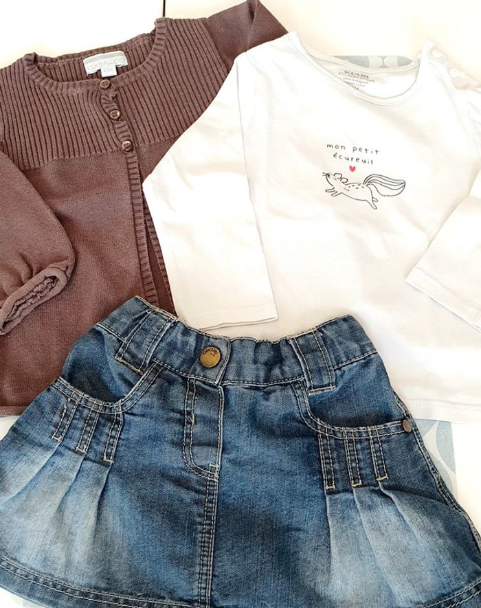 Ensemble avec gilet marron Kimbaloo, haut ML blanc Kiabi et jupe en jeans Obaibi - Taille 12 mois
