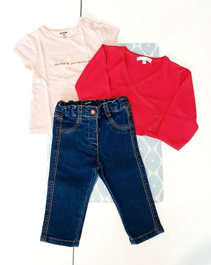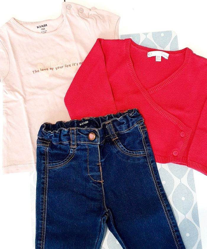 Ensemble avec t-shirt rose + jeans Kiabi et gilet rouge Kitchoun - Taille 9 mois