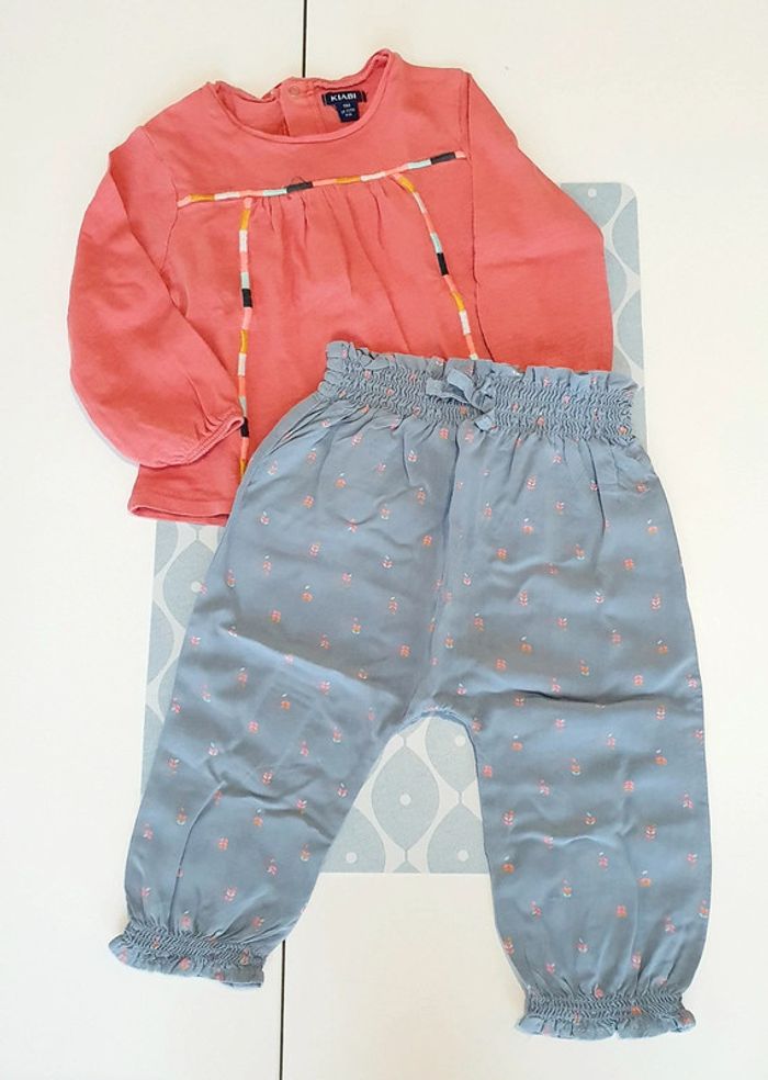Ensemble Kiabi avec haut ML orange/corail et pantalon fluide bleu - Taille 9 mois
